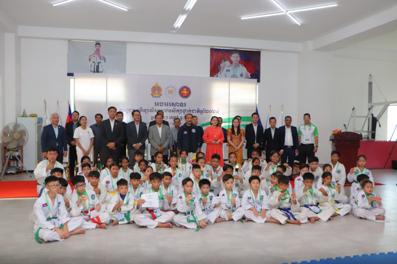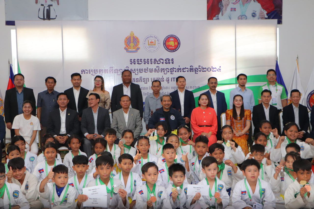 ភ្នំពេញ៖លោកទេសរដ្ឋមន្ត្រី កែវ រ៉េមី ប្រធានគណៈកម្មាធិការសិទ្ធិមនុស្សកម្ពុជា និងជាប្រធានសហព័ន្ធកីឡាតេក្វាន់ដូ ITF កម្ពុជាបិទការប្រកួតកីឡាតេក្វាន់ដូ ITF សិស្សបឋមសិក្សាថ្នាក់ជាតិ ឆ្នាំ២០២៤ កាលពីល្ងាចថ្ងៃទី០៦ ខែមេសា ឆ្នាំ២០២៤ នៅសាលមជ្ឈមណ្ឌលជាតិហ្វឹកហ្វឺនកីឡានៃពហុកីឡដ្ឋានជាតិអូឡាំពិក។