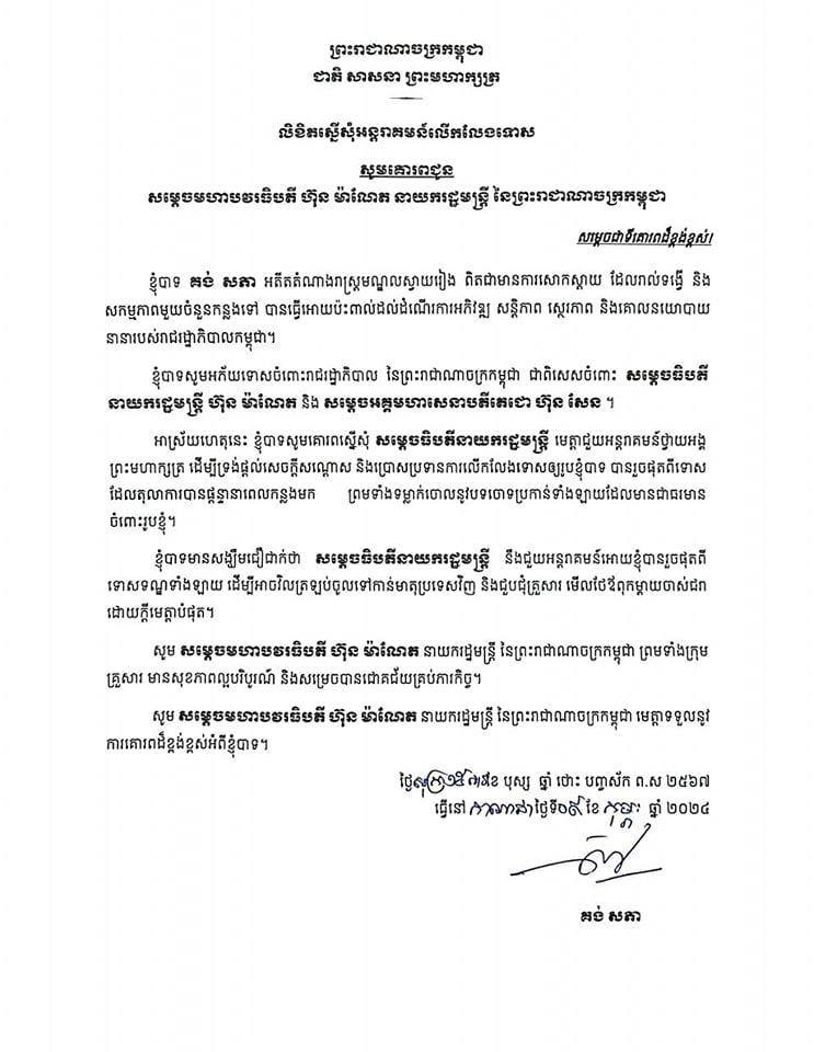 សូមបញ្ជាក់ថា លោក គង់ សភា អតីតំណាងរាស្ត្រ អតីតគណបក្សសង្គ្រោះជាតិ តាមរយៈលិខិតមួយនាថ្មីៗនេះ បានទទួលស្គាល់កំហុស ហើយបានស្នើសម្តេចធិបតី ហ៊ុន ម៉ាណែត អន្តរាគមន៍លើកលែងទោស ដើម្បីលោកអាចវិលមកខ្មែរវិញ និងជួបជុំគ្រួសារ មើលថែឪពុកម្តាយចាស់ជរា៕