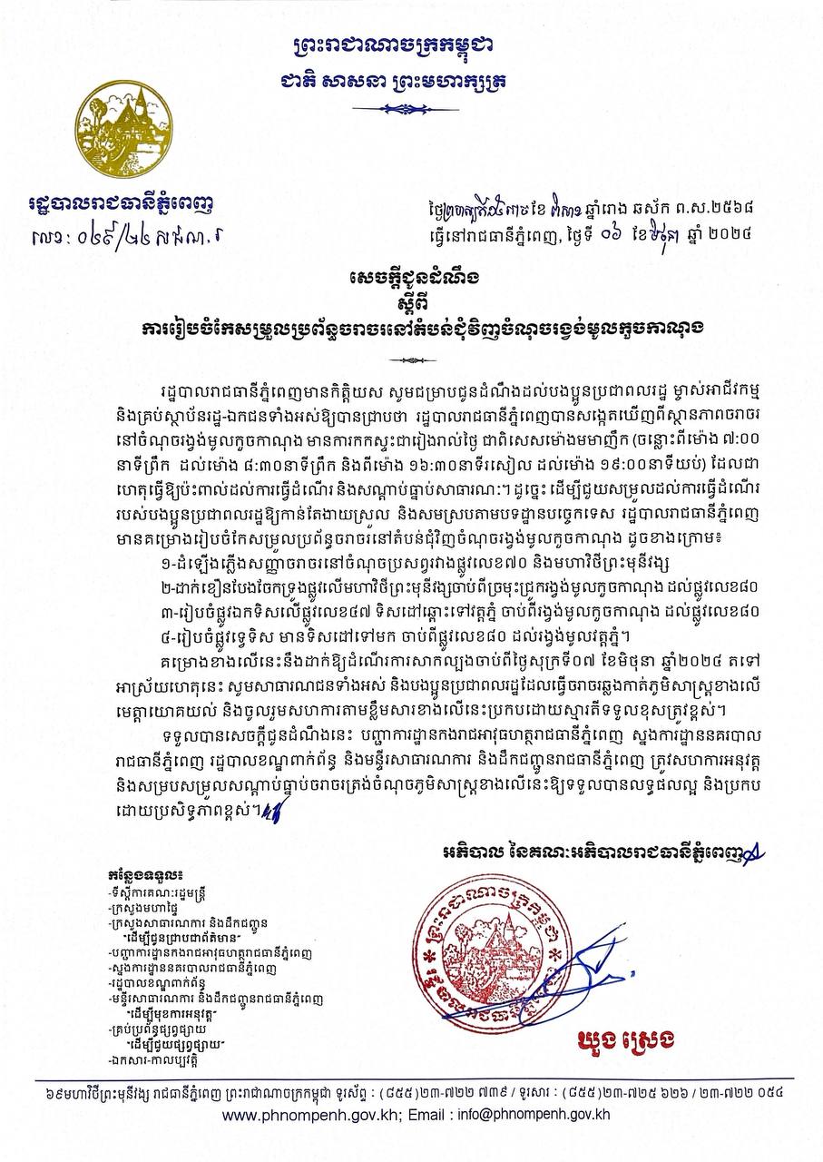 ទទួលបានសេចក្តីជូនដំណឹងនេះ បញ្ជាការដ្ឋានកងរាជអាវុធហត្ថរាជធានីភ្នំពេញ ស្នងការដ្ឋាននគរបាលរាជធានីភ្នំពេញ រដ្ឋបាលខណ្ឌពាក់ព័ន្ធ និងមន្ទីរសាធារណការ និងដឹកជញ្ជូនរាជធានីភ្នំពេញ ត្រូវសហការអនុវត្តនិងសម្របសម្រួលសណ្តាប់ធ្នាប់ចរាចរត្រង់ចំណុចភូមិសាស្ត្រខាងលើនេះឱ្យទទួលបានលទ្ធផលល្អ និងប្រកបដោយប្រសិទ្ធភាពខ្ពស់៕