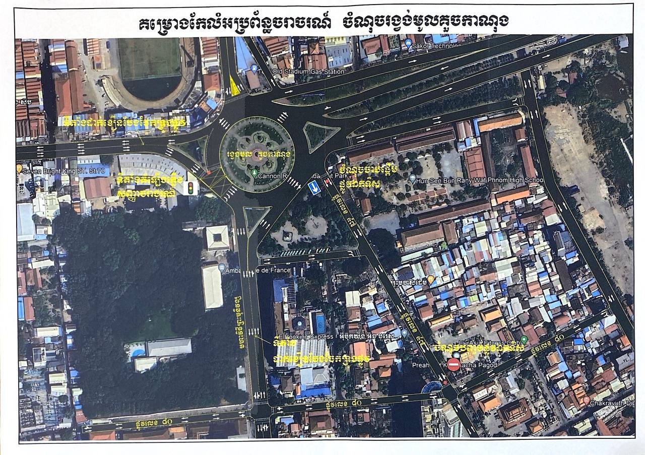 ភ្នំពេញ៖ រដ្ឋបាលរាជធានីភ្នំពេញ នឹងធ្វើការដំឡើងភ្លើងសញ្ញាចរាចរនៅចំណុច ប្រសព្វរវាងផ្លូវលេខ៧០ និងមហាវិថីព្រះមុនីវង្ស ដាក់ខឿនបែងចែកទ្រូងផ្លូវលើមហាវិថីព្រះមុនីវង្ស រៀបចំផ្លូវលេខ៤៧ជាផ្លូវ ឯកទិស និង រៀបចំផ្លូវទ្វេទិសមានទិសដៅទៅមក ចាប់ពីផ្លូវលេខ៨០ ដល់រង្វង់មូលវត្តភ្នំ ដេីម្បីកាត់បន្ថយ ការ កកស្ទះ ចរាចរនៅ តំបន់ រង្វង់ មូល កួចកាណុង។