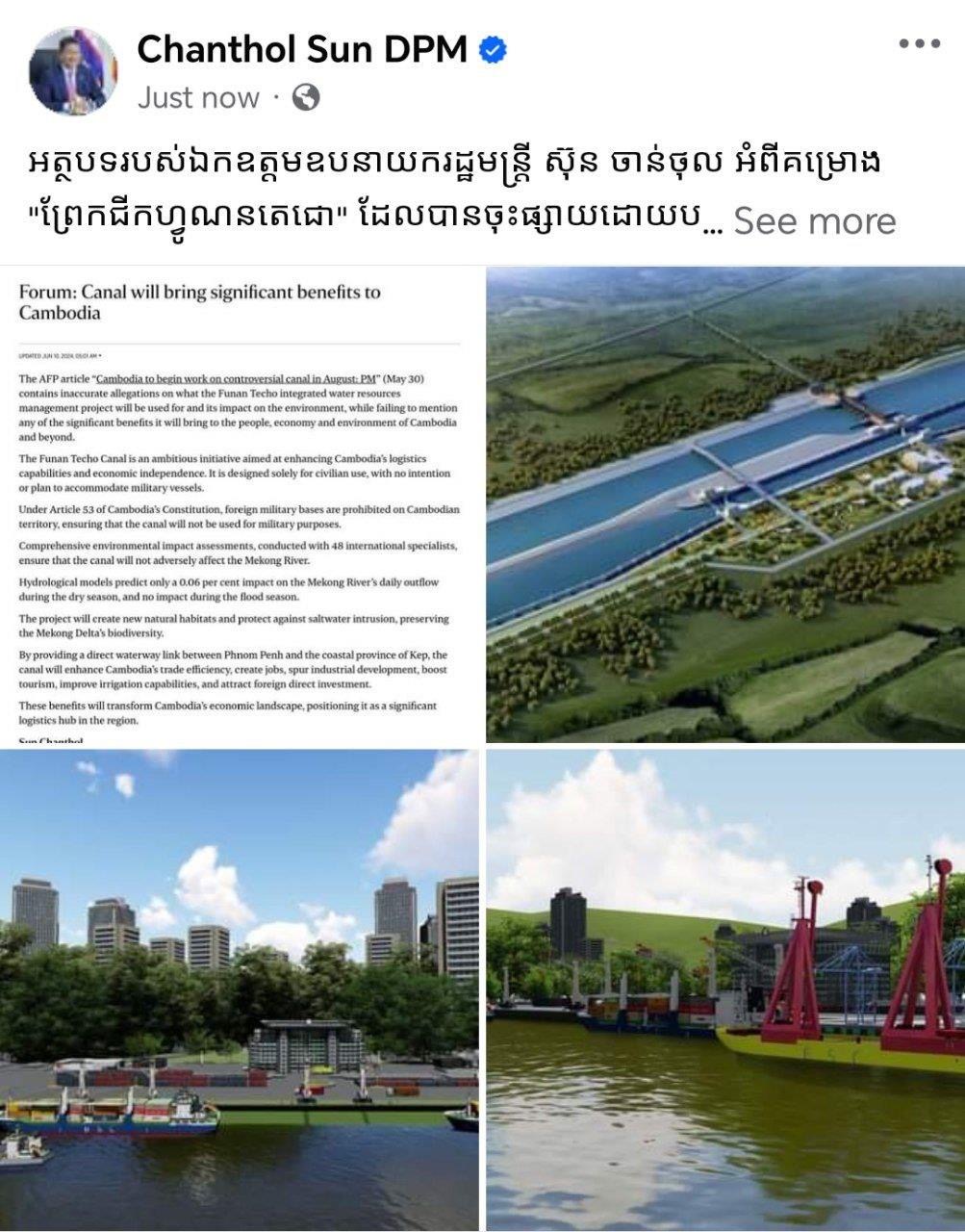 អត្ថបទរបស់ឯកឧត្ដមឧបនាយករដ្ឋមន្ត្រី ស៊ុន ចាន់ថុល ឆ្លើយតបទៅនឹងការផ្សាយរបស់ទីភ្នាក់ងារ សារព័ត៌មានបារាំង AFP។ កាលពីថ្ងៃទី៣០ ខែឧសភា ឆ្នាំ២០២៤កន្លងទៅនេះ សារព័ត៌មាន AFP បានផ្សាយអត្ថបទមួយពាក់ព័ន្ធនឹងព្រែកជីកហ្វូណនតេជោ ដោយដាក់ចំណងជើងថា «កម្ពុជា នឹងចាប់ផ្តើមការដ្ឋានគម្រោងព្រែកជីកដែលមានភាពចម្រូងចម្រាសនៅខែសីហា»។