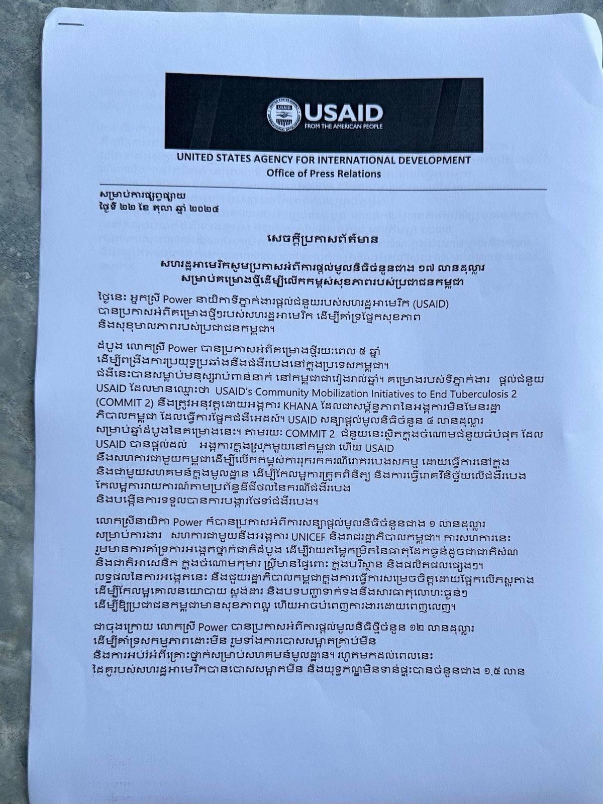 ការប្រកាសនេះធ្វើឡើងតាមរយៈសន្និសីទសារព័ត៌មានរបស់អ្នកស្រី Power នាយិកាទីភ្នាក់ងារផ្តល់ជំនួយរបស់សហរដ្ឋអាមេរិក (USAID) ដែលធ្វើឡើងនាថ្ងៃទី២២ ខែតុលា នៅវត្តស្វាយធំ ខេត្តសៀមរាប។