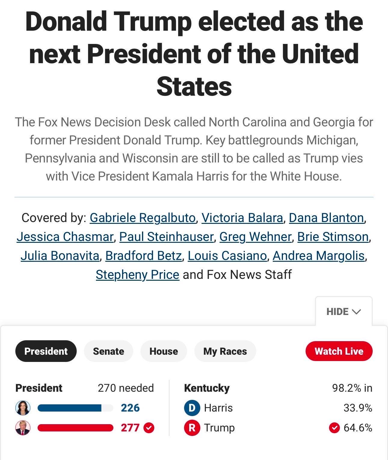 តាមរយៈលទ្ធផលបោះឆ្នោតនេះ លោក ដូណាល់ ត្រាំ អាយុ៧៨ឆ្នាំ នឹងក្លាយជាប្រធានាធិបតីទី៤៧របស់សហរដ្ឋអាមេរិក និងជាអាណត្តិ២របស់លោក ខណៈលោក J.D. Vance ឬ James David Vance នឹងក្លាយជាអនុប្រធានាធិបតីរបស់លោក៕