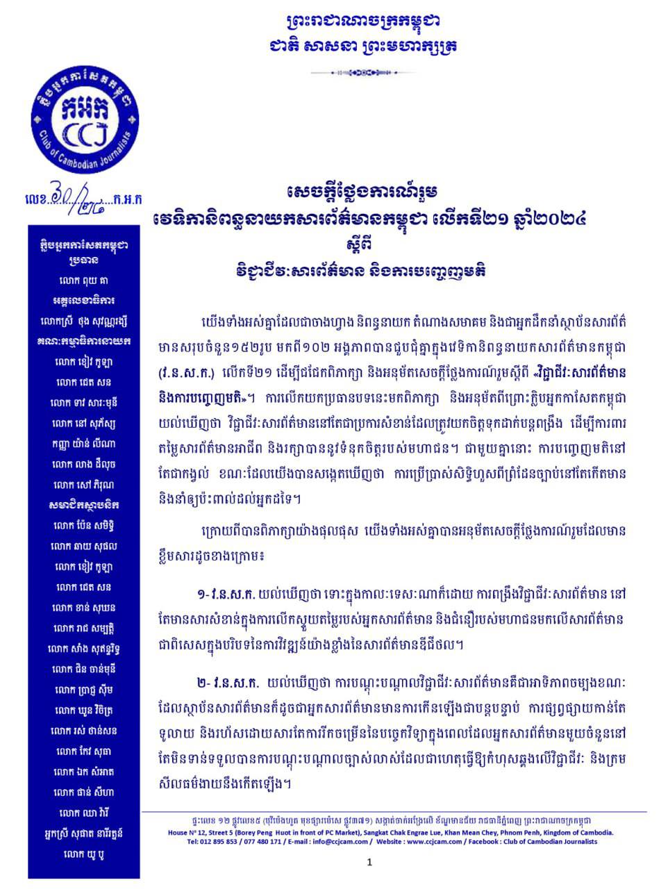 ក្លិបអ្នកកាសែតកម្ពុជាយល់ឃើញថា វិជ្ជាជីវៈសារព័ត៌មាននៅតែជាប្រការសំខាន់ដែលត្រូវយកចិត្តទុកដាក់បន្តពង្រឹង ដើម្បីការពារ តម្លៃសារព័ត៌មានអាជីព និងរក្សាបាននូវទំនុកចិត្តរបស់មហាជន។ ជាមួយគ្នានោះ ការបញ្ចេញមតិនៅតែជាកង្វល់ ខណៈដែល យើងបានសង្កេតឃើញថា ការប្រើប្រាស់សិទ្ធិហួសពីព្រំដែនច្បាប់នៅតែកើតមាន និងនាំឲ្យប៉ះពាល់ដល់អ្នកដទៃ។