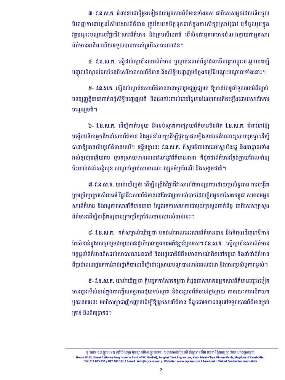 ២. ចូលរួមថែរក្សាសុខសន្តិភាព ការអភិវឌ្ឍប្រទេសជាតិ និងពង្រឹងលទ្ធិប្រជាធិបតេយ្យផ្អែកលើ ការអនុវត្តច្បាប់ ក្រមសីលធម៌វិជ្ជាជីវៈឱ្យបានខ្ជាប់ខ្ជួន និងត្រូវលុបបំបាត់ជនឱកាសនិយមដែល ជ្រកក្រោមស្លាកសារព័ត៌មាន។