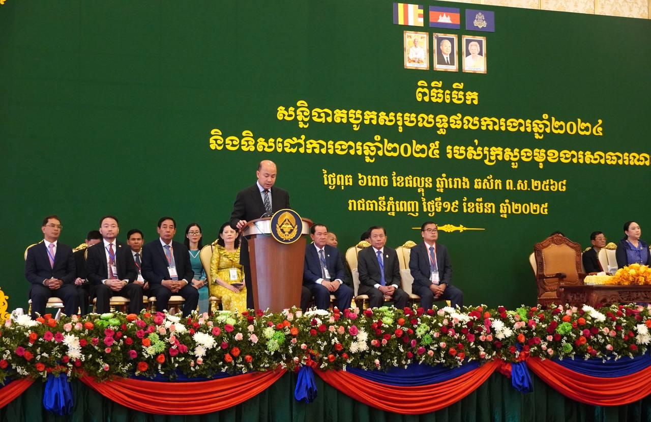 ភ្នំពេញ៖ឯកឧត្ដម ហ៊ុន ម៉ានី ឧបនាយករដ្ឋមន្ត្រី រដ្ឋមន្ត្រីក្រសួងមុខងារសាធារណៈ នាព្រឹកថ្ងៃទី១៩ ខែមីនា ឆ្នាំ២០២៥នេះ បានអញ្ជើញជាអធិបតីដ៏ខ្ពង់ខ្ពស់ ក្នុងពិធីបើក «សន្និបាតបូកសរុបលទ្ធផលការងារឆ្នាំ២០២៤ និងលើកទិសដៅការងារឆ្នាំ២០២៥ របស់ក្រសួងមុខងារសាធារណៈ» នៅ ដឺព្រេមៀសេនធ័រសែនសុខ រាជធានីភ្នំពេញ។