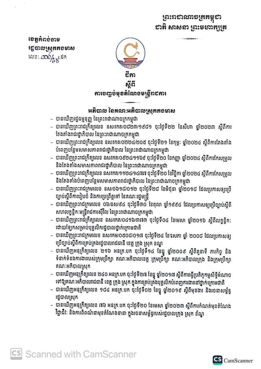 កំពងចាម៖ឯកឧត្ដមអ៊ុន ចាន់ដា អភិបាលខេត្ដកំពង់ចាម នៅថ្ងៃទី២៧ ខែមីនា ឆ្នាំ២០២៥នេះ បានចេញសេចក្តីសម្រេចបញ្ចប់មុខតំណែងលោក ហែម គឹមសាធ ពីប្រធានការិយាល័យរដ្ឋបាល និងហិរញ្ញវត្ថុ មកជាមន្ដ្រីការិយាល័យកសិកម្ម ធន់ធានធម្មជាតិ និងបរិស្ថានស្រុកកងមាស ដោយសារមានកំហុស ទារយកលុយពលរដ្ឋ ៣៦០ដុល្លារ រឿងកែសំបុត្រកំណើត៕