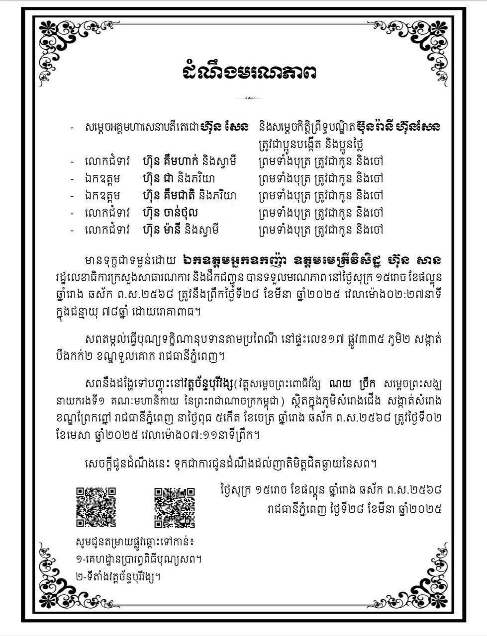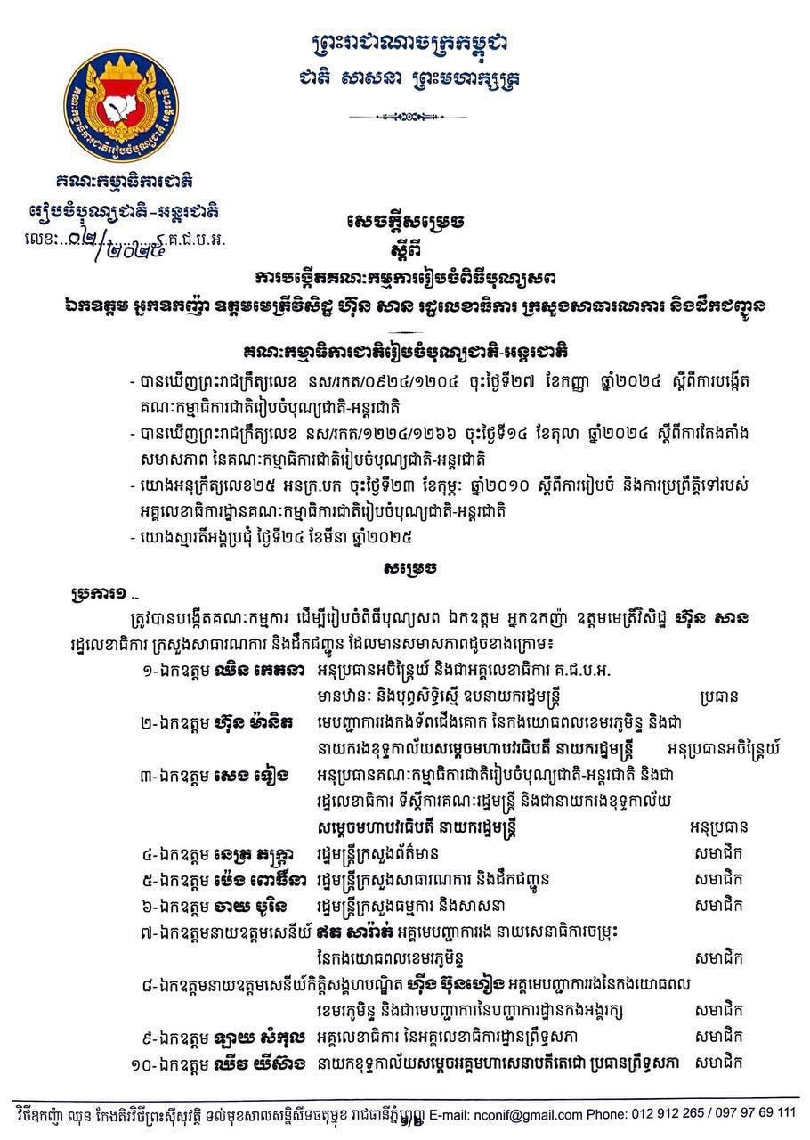 ភ្នំពេញ៖គណ:កម្មាធិការជាតិរៀបចំបុណ្យជាតិ-អន្តរជាតិ បង្កើតគណ:កម្មការរៀបចំបុណ្យសព ឯកឧត្តម អ្នកឧកញ៉ា ឧត្តមមេត្រីវិសិដ្ឋ ហ៊ុន សាន រដ្ឋលេខាធិការក្រសួងសាធារណការ និងដឹកជញ្ជូន។ នេះបើតាមសេចក្តីសម្រេចដែល ទទួលបាននៅព្រឹកថ្ងៃទី២៨ ខែមីនា ឆ្នាំ២០២៥នេះ។