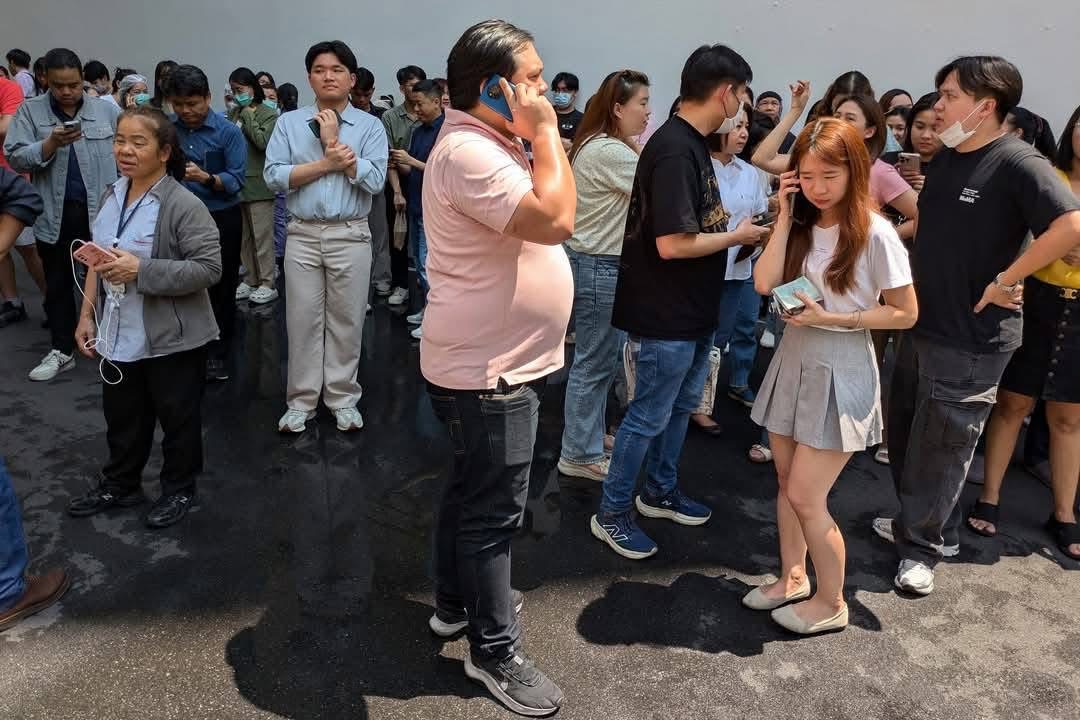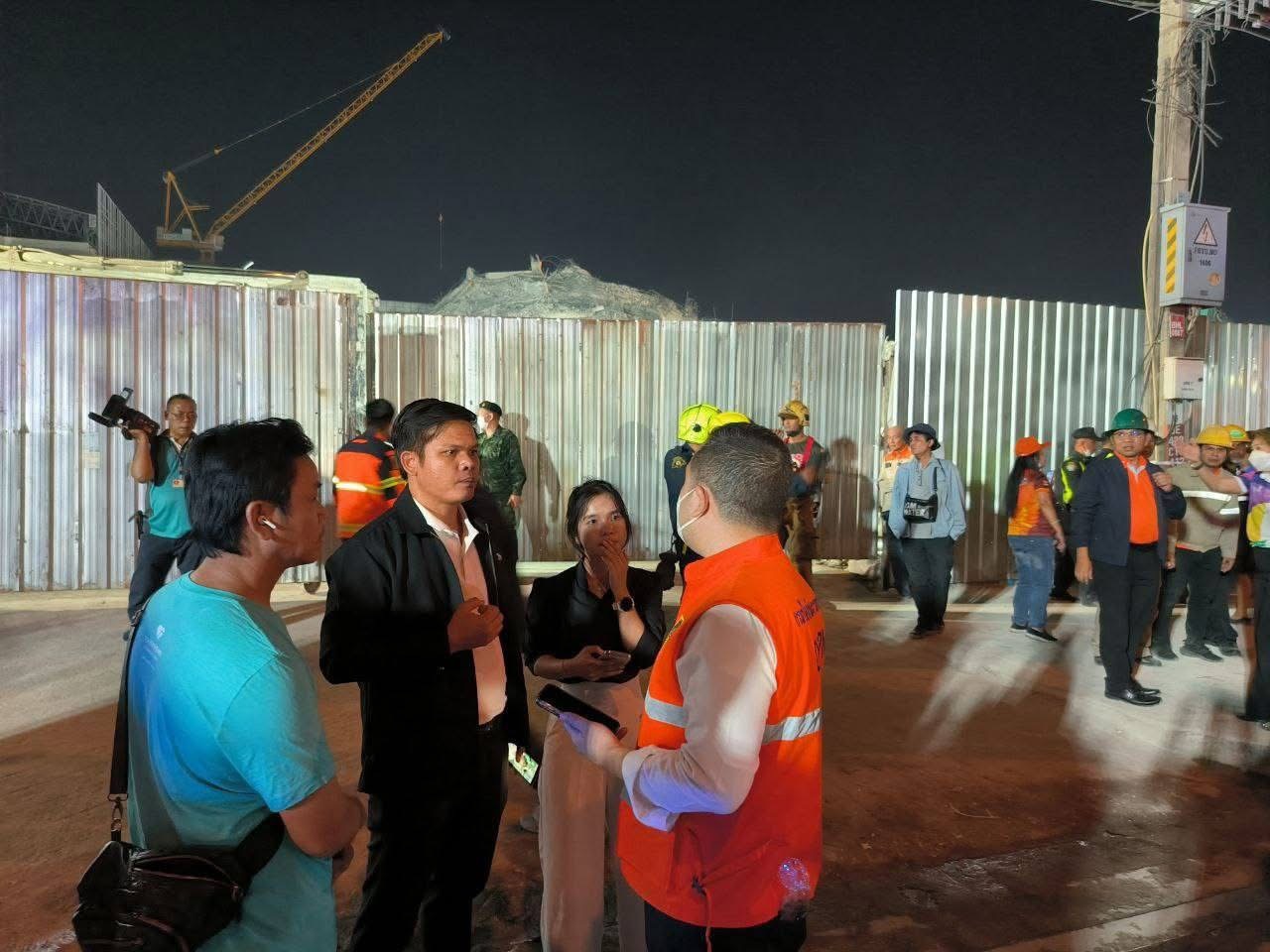 ភ្នំពេញ៖លោក ឈឹម វិបុល (ទូរសព្ទលេខ ០៨៣ ៥៤៥ ៧៧៨៨) និងកញ្ញា ឡាយ ចន្ថា (ទូរសព្ទលេខ ០៩២ ២៩៩ ០១៣៣) អនុព័ន្ធការងារ អមស្ថានឯកអគ្គរាជទូតកម្ពុជាប្រចាំប្រទេសថៃ បានស្ថិតនៅទីតាំងអាគារ ដែលកំពុងសាងសង់ហើយត្រូវបានរលំដោយសារគ្រោះរញ្ជួយដី ដើម្បីពិនិត្យស្ថានភាពជាក់ស្តែង និងរងចាំព័ត៌មានផ្លូវការពីអាជ្ញាធរមានសមត្ថកិច្ចថៃ។