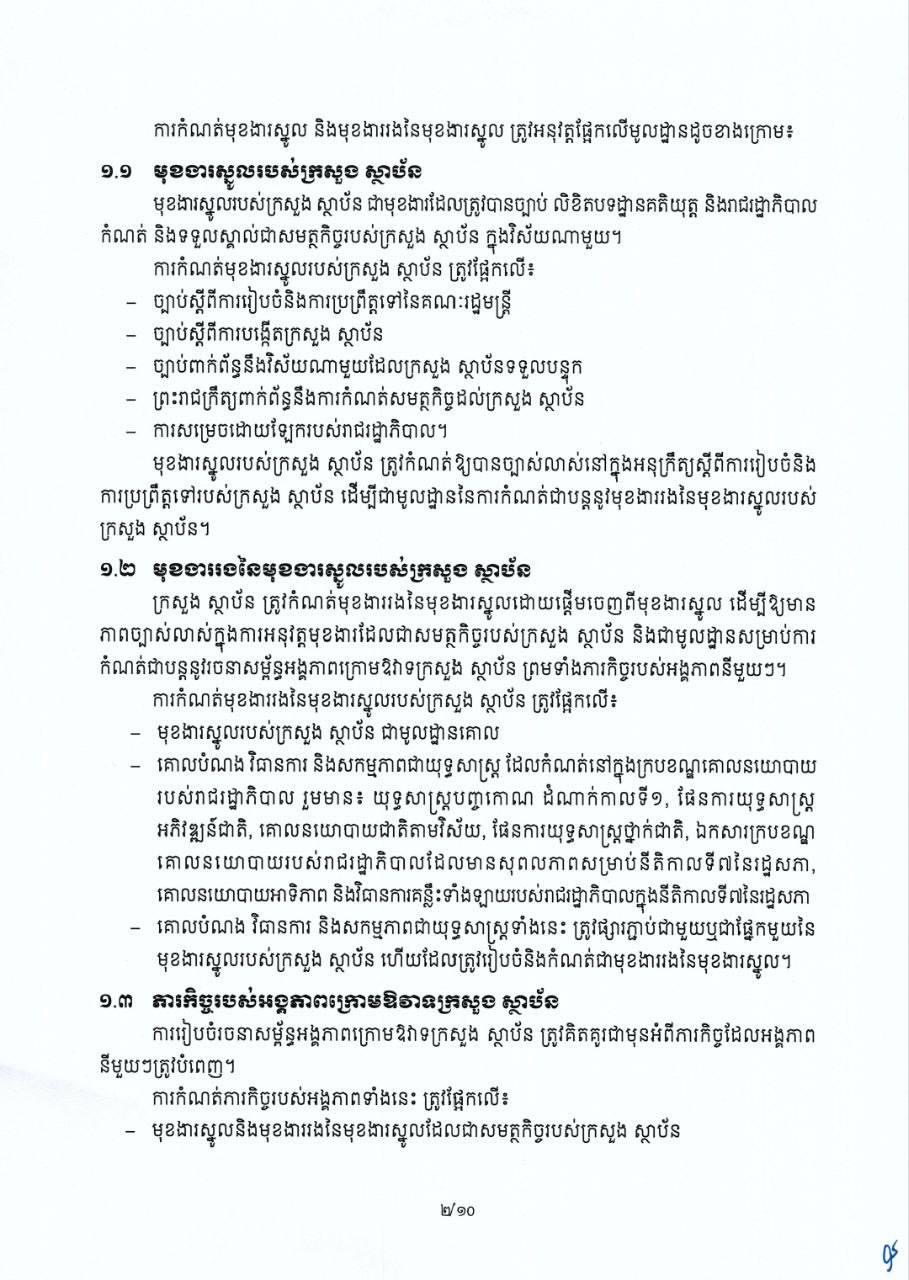 ក្នុងសារាចរនេះ រាជរដ្ឋាភិបាលកម្ពុជា បានណែនាំក្រសួង ស្ថាប័នរដ្ឋ ត្រូវកំណត់មុខងាររបស់ខ្លួនឱ្យបានច្បាស់លាស់ ដែលជាមុខងារស្នូលតាមវិស័យ និងមុខងាររងនៃមុខងារស្នូលតាមវិស័យ។