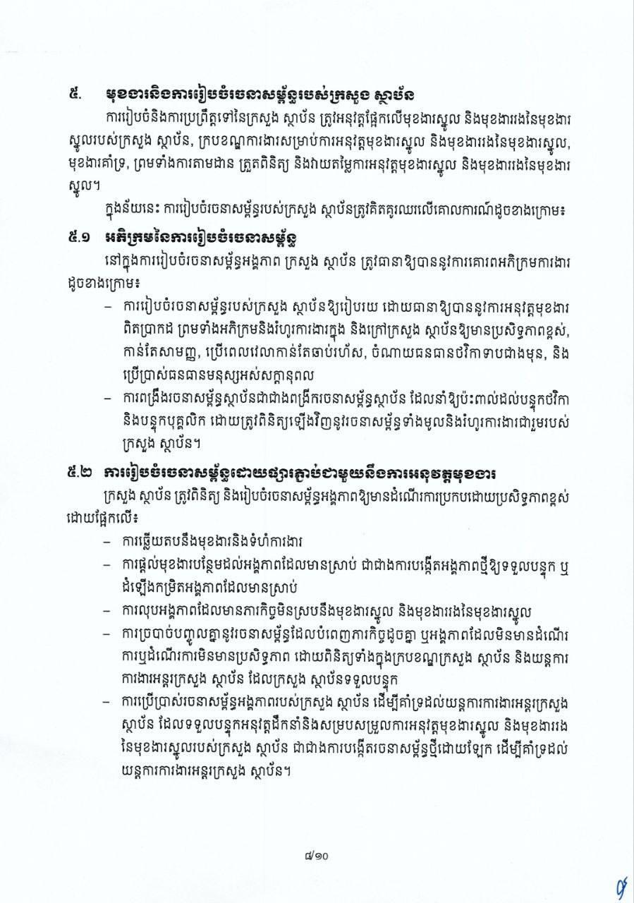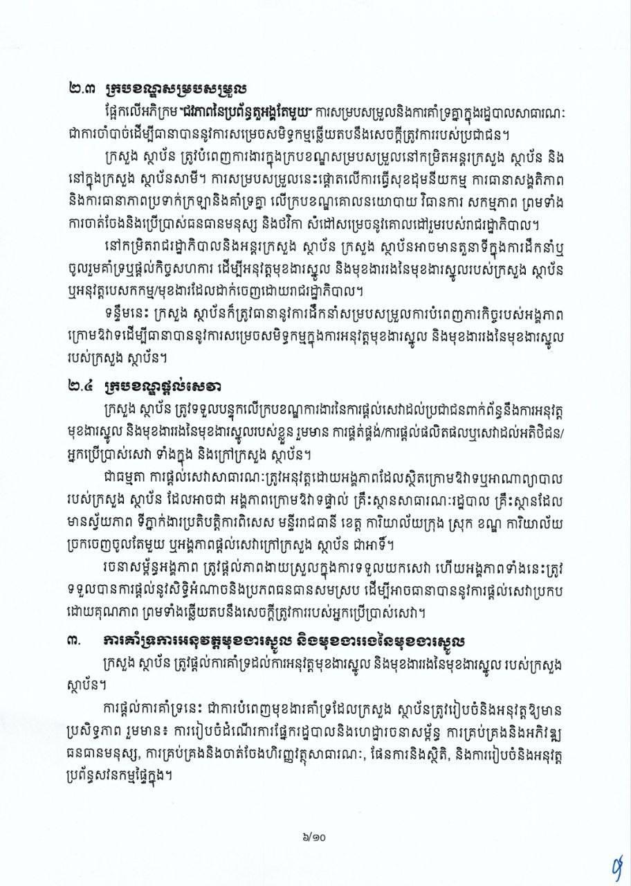 រាជរដ្ឋាភិបាល ក៏បានណែនាំក្រសួង ស្ថាប័ន ត្រូវពិនិត្យ រៀបចំ និងកំណត់ក្របខណ្ឌការងារឱ្យបានច្បាស់លាស់ ដើម្បីជាមូលដ្ឋាននៃការរៀបចំរចនាសម្ព័ន្ធអង្គភាព, យន្តការស្ថាប័ន និងប្រព័ន្ធការងារ ឬវិធីសាស្ត្របំពេញការងារសមស្របផ្សេងៗ ដើម្បីធានាការអនុវត្តមុខស្នូល និងមុខងាររងនៃមុខងារស្នូលរបស់ក្រសួង ស្ថាប័ន ឱ្យមានប្រសិទ្ធភាប។
