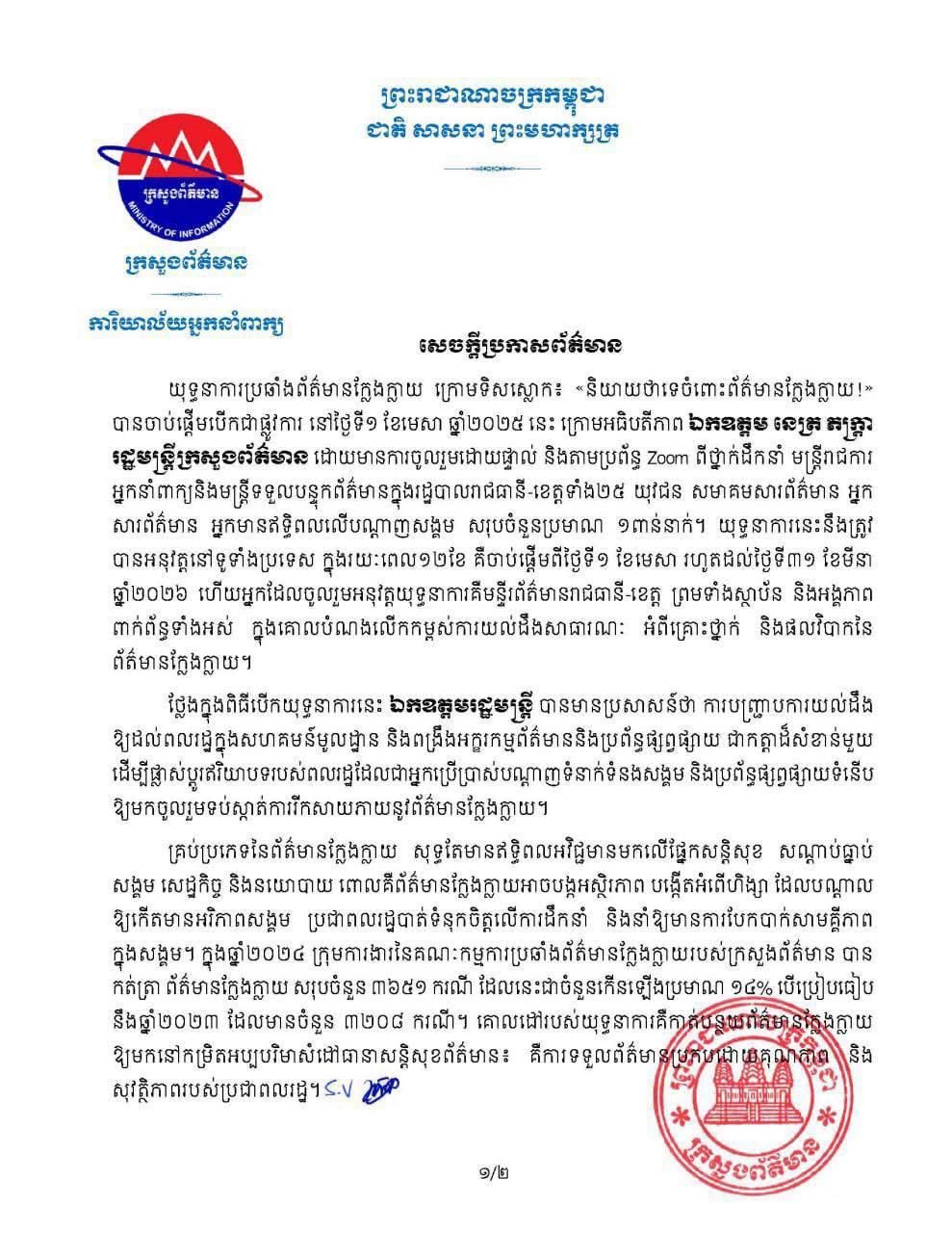 ភ្នំពេញ៖ក្រសួងព័ត៌មាន បានចេញសេចក្តីប្រកាសព័ត៌មានពីយុទ្ធនាការប្រឆាំងព័ត៌មានក្លែងក្លាយ ក្រោមទិសស្លោក៖ «និយាយថាទេចំពោះព័ត៌មានក្លែងក្លាយ! Say No To Fake News» ដោយបានចាប់ផ្តើមបើកជាផ្លូវការ នៅថ្ងៃទី១ ខែមេសា ឆ្នាំ២០២៥នេះ។ យុទ្ធនាការនេះនឹងត្រូវបានអនុវត្តនៅទូទាំងប្រទេស ក្នុងរយៈពេល១២ខែ គឺចាប់ផ្តើមពីថ្ងៃទី១ ខែមេសា រហូតដល់ថ្ងៃទី៣១ ខែមីនា ឆ្នាំ២០២៦ ហើយអ្នកដែលចូលរួមអនុវត្តយុទ្ធនាការគីមន្ទីរព័ត៌មានរាជធានី-ខេត្ត ព្រមទាំងស្ថាប័ន និងអង្គភាពពាក់ព័ន្ធទាំងអស់ ក្នុងគោលបំណងលើកកម្ពស់ការយល់ដឹងសាធារណៈ អំពីគ្រោះថ្នាក់ និងផលវិបាកនៃព័ត៌មានក្លែងក្លាយ។