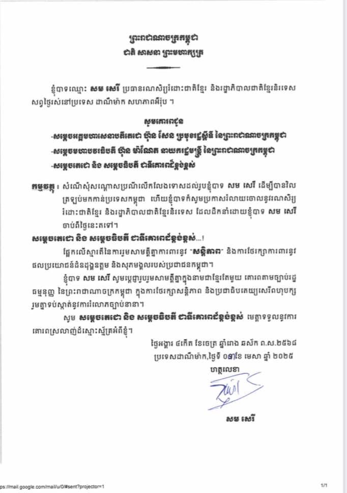 ឈប់ប្រឆាំងហើយ!លោក សម សេរី ប្រកាសរំលាយរណសិរ្យរំដោះជាតិខ្មែរ និងរដ្ឋាភិបាលជាតិខ្មែរនិរទេស ហើយស្នើសម្តេចតេជោ ហ៊ុន សែន និងសម្តេចបវរធិបតី ហ៊ុន ម៉ាណែត លើកលែងទោស ដើម្បីបានត្រឡប់មកកម្ពុជាវិញ