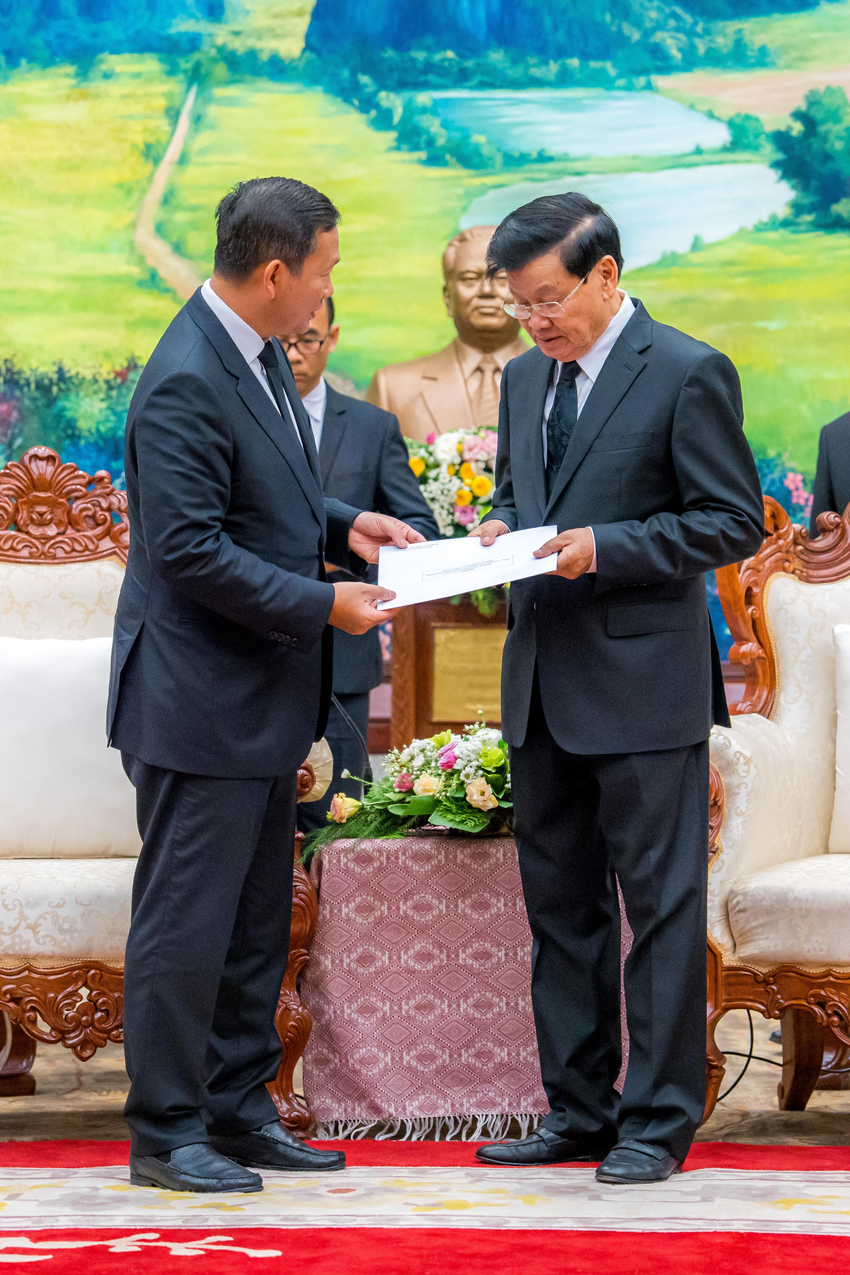 លោក ប្រធាន រដ្ឋ បានវាយតម្លៃ ខ្ពស់ ចំពោះ វត្តមានរបស់សម្តេច មហាបវរ ធិប តី និង គណៈប្រតិភូ ជាន់ខ្ពស់ កម្ពុជា ក្នុង ឱកាសដ៏ក្រៀមក្រំ នេះ។ សម្រាប់ ប្រធាន រដ្ឋឡាវ វត្តមានរបស់សម្តេចមហាបវរធិបតីនាពេលនេះ បង្ហាញ ឱ្យ ឃេីញ នូវ ទំនាក់ទំនង ជាប្រពៃណី មិត្ត ភាព សាមគ្គីភាព និង ភាពជា ដៃគូ យុទ្ធសាស្ត្រ គ្រប់ ជ្រុងជ្រោយ និង យូរអង្វែង រវាង ប្រទេសទាំងពីរ ។