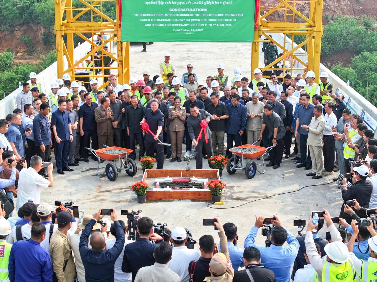 ពោធិ៍សាត់៖ នាព្រឹកថ្ងៃអង្គារ ទី៨ ខែមេសា ឆ្នាំ២០២៥ ឯកឧត្ដម ស៊ុន ចាន់ថុល ឧបនាយករដ្ឋមន្ត្រី អនុប្រធានទី១ ក្រុមប្រឹក្សាអភិវឌ្ឍន៍កម្ពុជា តំណាងដ៏ខ្ពង់ខ្ពស់សម្តេចមហាបវ រ ធិប តី ហ៊ុន ម៉ាណែត នាយករដ្ឋមន្ត្រីកម្ពុជាដែលអមដំណើរដោយឯកឧត្តម ប៉េង ពោធិ៍នា រដ្ឋមន្រ្តីក្រសួងសាធារណការ និងដឹកជញ្ជូនចាក់បេតុងតភ្ជាប់មុខតំណស្ពានខ្ពស់ជាងគេនៅកម្ពុជា នៃគម្រោងផ្លូវជាតិលេខ១៥៥១ (ផ.ជ.១០) និងបើកឱ្យប្រើប្រាស់ជាបណ្តោះអាសន្ន ពីថ្ងៃទី១១ ដល់ថ្ងៃទី១៧ ខែមេសា ឆ្នាំ២០២៥ ក្រោមអធិបតីភាព និងដោយមានការចូលរួមពី ឯកឧត្តម លោកជំទាវ ប្រធានក្រុមប្រឹក្សាភិបាល/អភិបាល នៃគណៈអភិបាលខេត្តពោធិ៍សាត់ បាត់ដំបង និងកោះកុង, ថ្នាក់ដឹកនាំ និងមន្ត្រីរាជការក្រសួង មន្ទីរសាធារណការ និងដឹកជញ្ជូនខេត្តពោធិ៍សាត់ បាត់ដំបង និងកោះកុង, តំណាងក្រុមហ៊ុនសាជីវកម្មស្ពាននិងថ្នល់ចិន CRBC, អាជ្ញាធរមូលដ្ឋាន, កងកម្លាំងសមត្ថកិច្ច និងបងប្អូនកម្មករសាងសង់ជាច្រើនរូប។