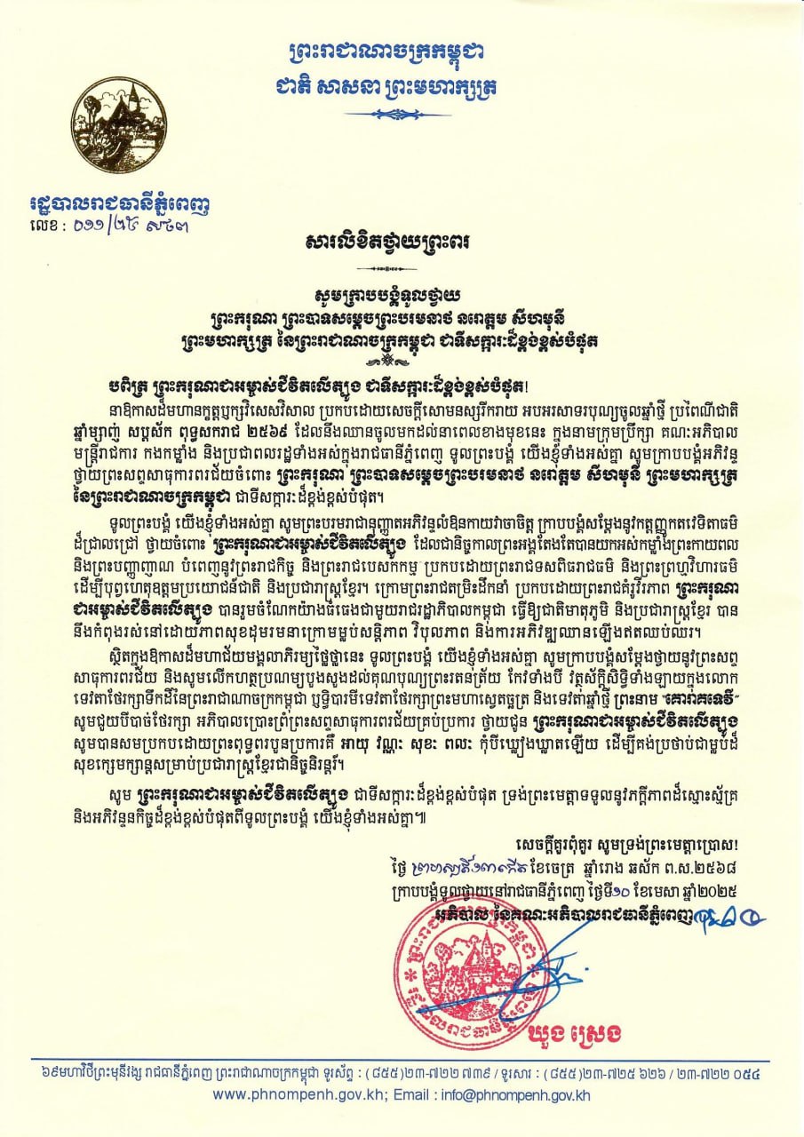 ភ្នំពេញ៖ឯកឧត្ដមឃួង ស្រេង អភិបាលនៃគណៈអភិបាលរាជធានីភ្នំពេញនិងឯកឧត្តម ម៉ប់ សារិន ប្រធានក្រុមប្រឹក្សារាជធានីភ្នំពេញផ្ញើរសារលិខិតថ្វាយព្រះពរ សូមក្រាបបង្គំទូលថ្វាយ ព្រះករុណា ព្រះបាទសម្តេចព្រះបរមនាថ នរោត្តម សីហមុនី ព្រះមហាក្សត្រ នៃព្រះរាជាណាចក្រកម្ពុជា ជាទីសក្ការៈដ៏ខ្ពង់ខ្ពស់បំផុត នាឱកាសដ៏មហានក្ខត្តឫក្សវិសេសវិសាល ប្រកបដោយសេចក្តីសោមនស្សរីករាយ អបអរសាទរបុណ្យចូលឆ្នាំថ្មី ប្រពៃណីជាតិ ឆ្នាំម្សាញ់ សប្តស័ក ពុទ្ធសករាជ ២៥៦៩ ដែលនឹងឈានចូលមកដល់នាពេលខាងមុខនេះ៕