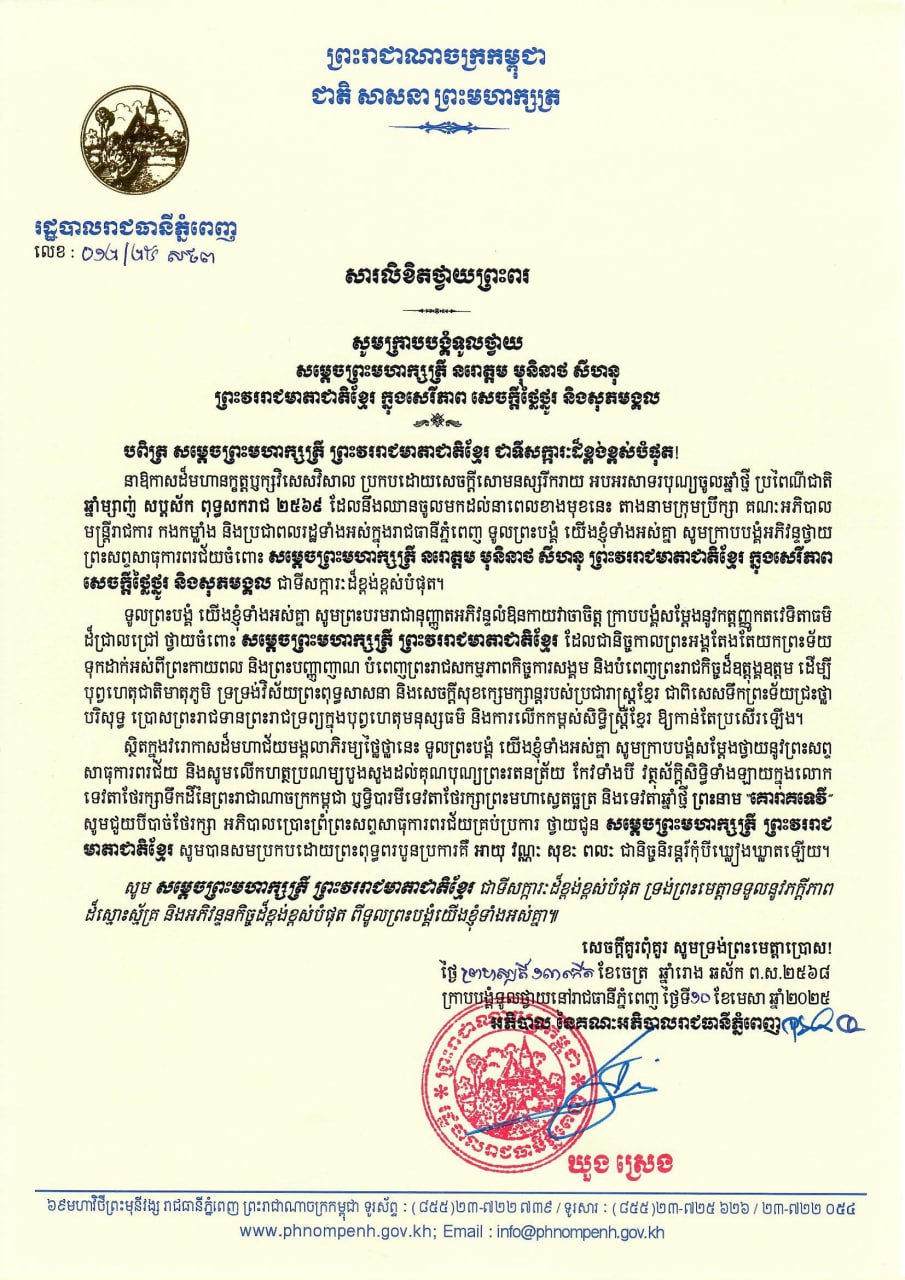 ភ្នំពេញ៖ឯកឧត្ដមឃួង ស្រេង អភិបាលនៃគណៈអភិបាលរាជធានីភ្នំពេញនិងឯកឧត្តម ម៉ប់ សារិន ប្រធានក្រុមប្រឹក្សារាជធានីភ្នំពេញផ្ញើរសារលិខិតថ្វាយព្រះពរ សូមក្រាបបង្គំទូលថ្វាយ សម្តេចព្រះមហាក្សត្រី នរោត្តម មុនិនាថ សីហនុ ព្រះវររាជមាតាជាតិខ្មែរ ក្នុងសេរីភាព សេចក្តីថ្លៃថ្នូរ និងសុភមង្គល នាឱកាសដ៏មហានក្ខត្តឫក្សវិសេសវិសាល ប្រកបដោយសេចក្តីសោមនស្សរីករាយ អបអរសាទរបុណ្យចូលឆ្នាំថ្មី ប្រពៃណីជាតិ ឆ្នាំម្សាញ់ សប្តស័ក ពុទ្ធសករាជ ២៥៦៩ ដែលនឹងឈានចូលមកដល់នាពេលខាងមុខនេះ៕