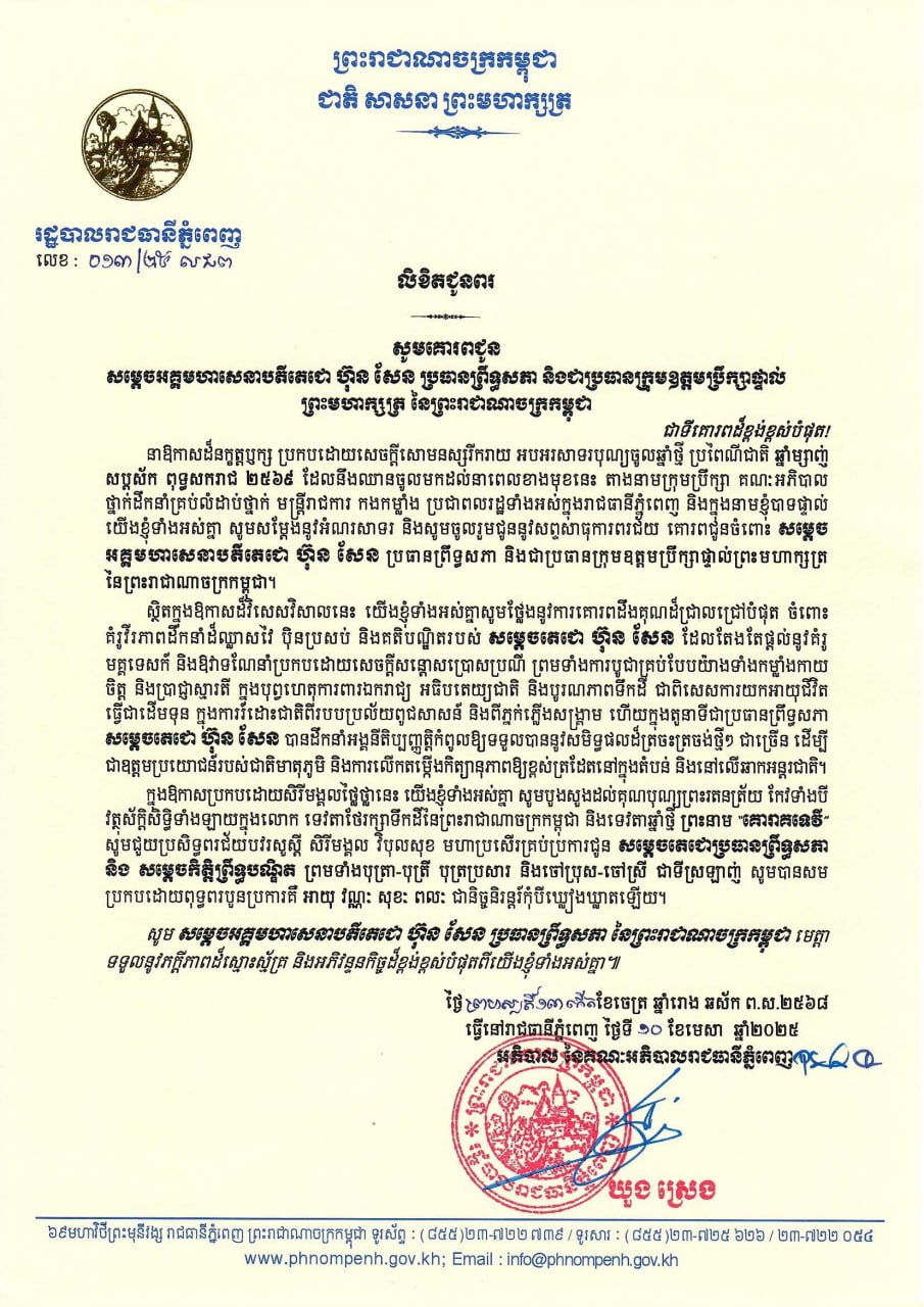 ភ្នំពេញ៖ឯកឧត្ដមឃួង ស្រេង អភិបាលនៃគណៈអភិបាលរាជធានីភ្នំពេញនិងឯកឧត្តម ម៉ប់ សារិន ប្រធានក្រុមប្រឹក្សារាជធានីភ្នំពេញផ្ញើរសារលិខិតគោរពជូនពរ សម្តេចអគ្គមហាសេនាបតីតេជោ ហ៊ុន សែន ប្រធានព្រឹទ្ធសភា និងជាប្រធានក្រុមឧត្តមប្រឹក្សាផ្ទាល់ ព្រះមហាក្សត្រ នៃព្រះរាជាណាចក្រកម្ពុជា នាឱកាសដ៏នក្ខត្តឫក្ស ប្រកបដោយសេចក្តីសោមនស្សរីករាយ អបអរសាទរបុណ្យចូលឆ្នាំថ្មី ប្រពៃណីជាតិ ឆ្នាំម្សាញ់ សប្តស័ក ពុទ្ធសករាជ ២៥៦៩ ដែលនឹងឈានចូលមកដល់នាពេលខាងមុខនេះ៕