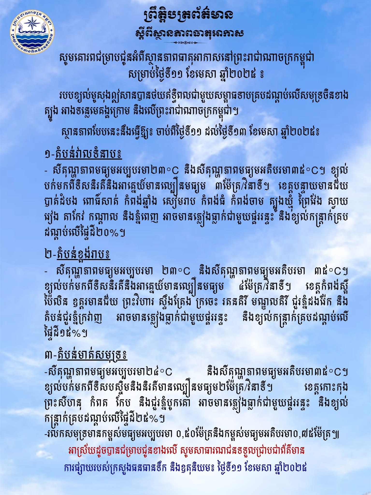 ក្រសួងធនធានទឹក ជូនដំណឹងអំពីស្ថានភាពធាតុអាកាសនៅកម្ពុជា សម្រាប់ថ្ងៃទី១១ ខែមេសា ឆ្នាំ២០២៥