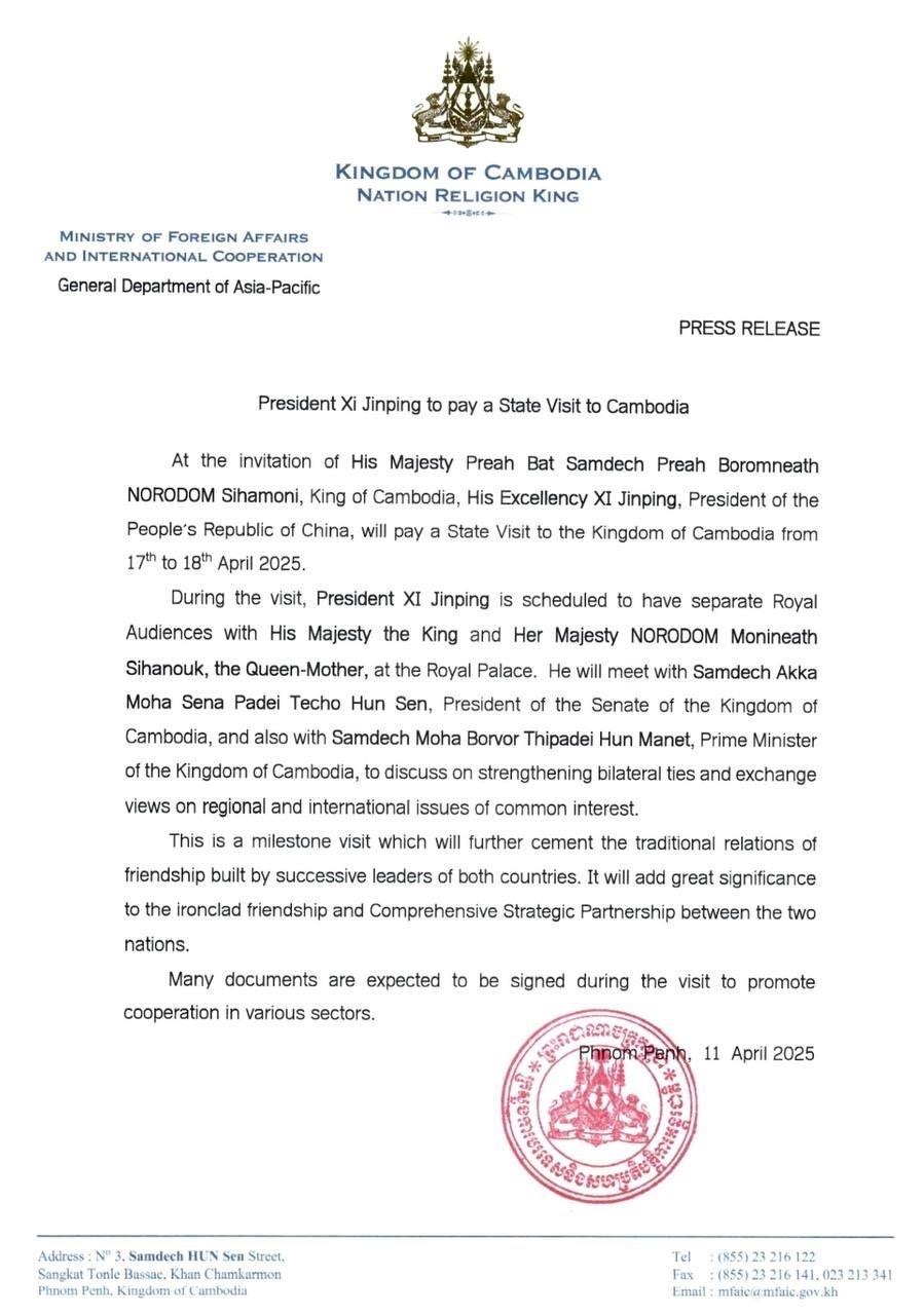 ភ្នំពេញ៖លោក ស៊ី ជីនពីង ប្រធានាធិបតី នៃសាធារណរដ្ឋប្រជាមានិតចិន នឹងអញ្ជើញមកបំពេញទស្សនកិច្ចផ្លូវរដ្ឋនៅព្រះរាជាណាចក្រកម្ពុជា រយៈពេល២ថ្ងៃ គឺនៅថ្ងៃទី១៧ និង១៨ ខែមេសា ឆ្នាំ២០២៥ ខាងមុខនេះ តបតាមការអញ្ជើញរបស់ព្រះករុណា ព្រះបាទ សម្តេចព្រះបរមនាថ នរោត្តម សីហមុនី ព្រះមហាក្សត្រ នៃព្រះរាជាណាចក្រកម្ពុជា។ នេះបើតាមការប្រកាសរបស់ក្រសួងការបរទេស ដែល ទទួលបាន។