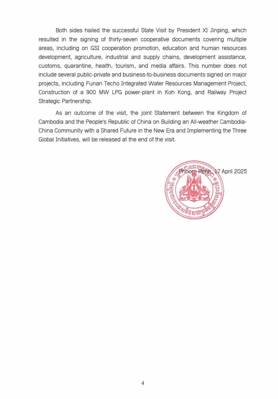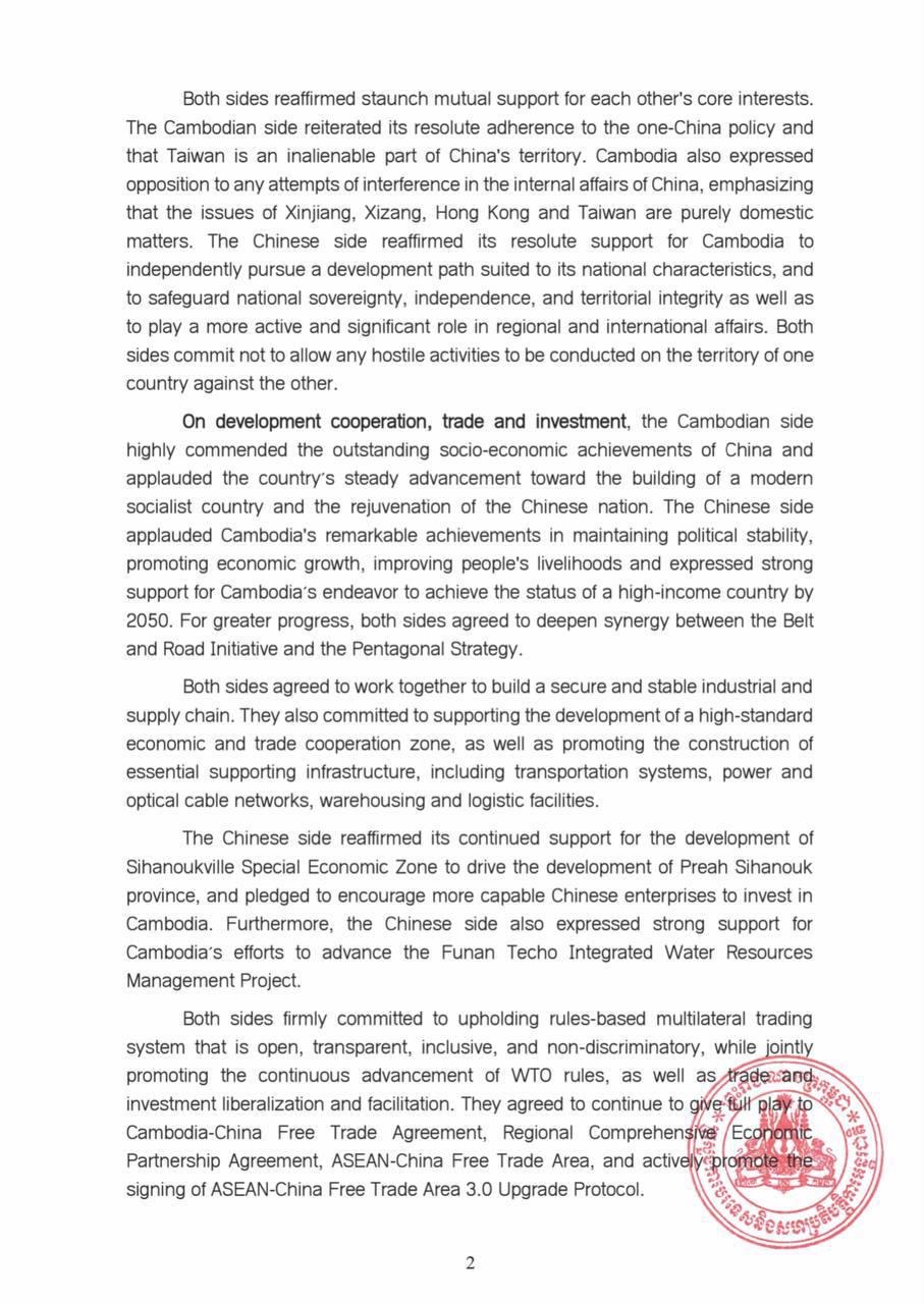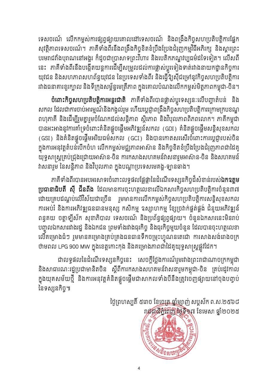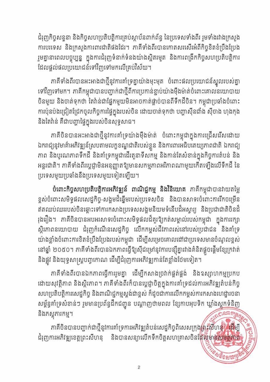 ដំណើរទស្សនកិច្ចនេះ ក៏បានបន្ថែមសន្ទុះថ្មីដល់ការកសាង សហ គមន៍ វាសនារួមកម្ពុជា-ចិន គ្រប់រដូវកាល ក្នុងយុគសម័យថ្មី ប្រកប ដោយគុណភាពខ្ពស់ កម្រិតខ្ពស់ និងស្តង់ដាខ្ពស់។ ក្នុងបរិការណ៍ នេះ ភាគីទាំងពីរបានសម្តែងការប្តេជ្ញាចិត្តក្នុងការ ធានាការអនុវត្ត ប្រកបដោយប្រសិទ្ធភាព នៃក្របខណ្ឌកិច្ចសហប្រតិបត្តិការត្បូង ពេជ្រ និងពន្លឿនការកសាង «ច្រករបៀង ឧស្សាហកម្ម និងបច្ចេក វិទ្យា» និង «ច្រករបៀងមច្ឆា និងអង្ករ»។