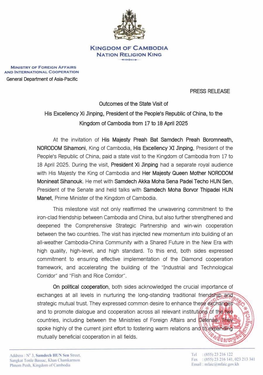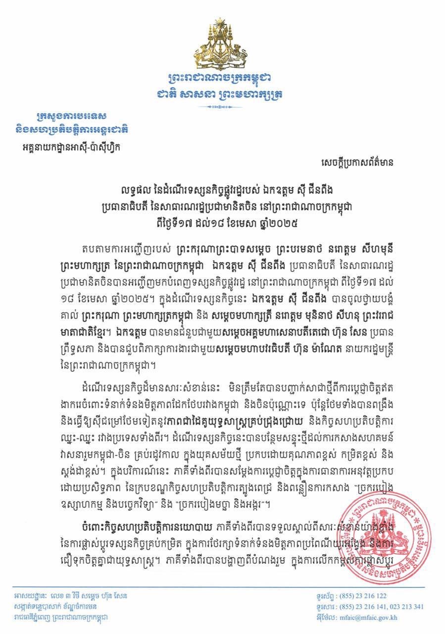 ក្រសួងការបរទេសកម្ពុជា បង្ហាញលទ្ធផលនៃដំណើរទស្សនកិច្ច របស់លោក ស៊ី ជីនពីង នៅកម្ពុជា