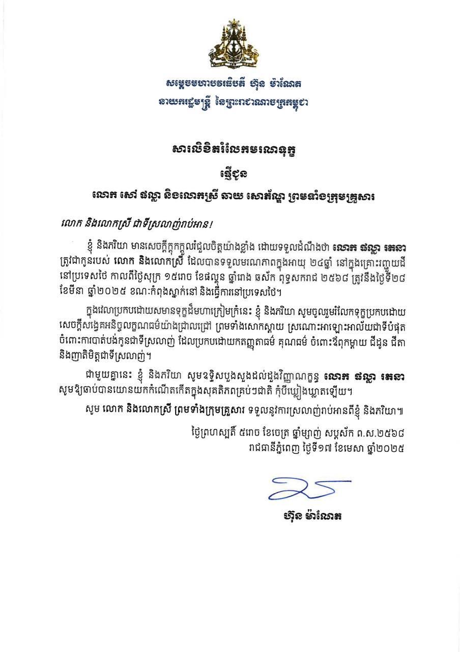 ភ្នំពេញ៖សម្ដេចបវរធិបតី ហ៊ុន ម៉ាណែត នាយករដ្ឋមន្ត្រីនៃកម្ពុជា បានសារលិខិតរំលែកមរណទុក្ខផ្ញើជូនលោក សៅ ផល្លានិងលោកស្រី ឆាយ សោភ័ណ្ឌ ព្រមទាំងក្រុមគ្រួសារ ចំពោះមរណភាពរបស់ លោក ផល្លា រតនា ត្រូវជាកូនរបស់ លោក និងលោកស្រី ដែលបានទទួលមរណភាពក្នុងអាយុ ២៤ឆ្នាំ នៅក្នុងគ្រោះរញ្ជួយដី នៅប្រទេសថៃ កាលពីថ្ងៃទី២៨ ខែមីនា ឆ្នាំ២០២៥ ខណៈកំពុងស្នាក់នៅ និងធ្វើការនៅប្រទេសថៃ។