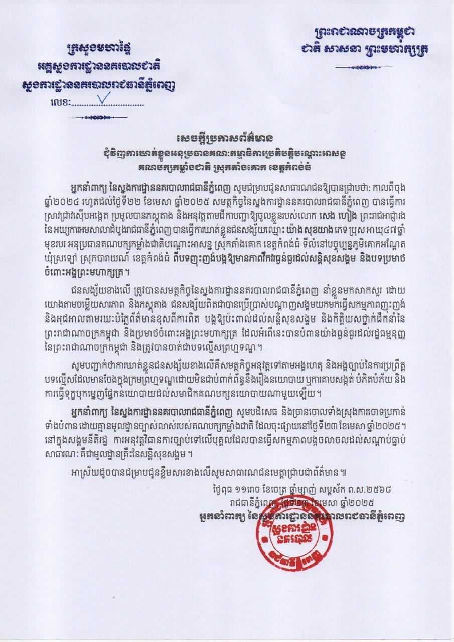 ក្នុងសេចក្ដីប្រកាសព័ត៌មាន បានឲ្យដឹងថា កាលពីចុងឆ្នាំ២០២៤ រហូតដល់ថ្ងៃទី២២ ខែមេសា ឆ្នាំ២០២៥ សមត្ថកិច្ចនៃស្នងការដ្ឋាននគរបាលរាជធានីភ្នំពេញ បានធ្វើការស្រាវជ្រាវស៊ើបអង្កេត ប្រមូលបានភស្តុតាង និងអនុវត្តតាមដីកាបញ្ជាឱ្យចូលខ្លួនរបស់លោក សេង ហៀង ព្រះរាជអាជ្ញារង នៃអយ្យការអមសាលាដំបូងរាជធានីភ្នំពេញ បានធ្វើការឃាត់ខ្លួនជនសង្ស័យឈ្មោះ យ៉ាង សុខឃាង ភេទ ប្រុស អាយុ៤៧ឆ្នាំ មុខរបរអនុប្រធានគណបក្សកម្លាំងជាតិបណ្តោះអាសន្ន ស្រុកតាំងគោក ខេត្តកំពង់ធំ ទីលំនៅបច្ចុប្បន្ន ភូមិគោកអណ្តែត ឃុំស្រឡៅ ស្រុកបារាយណ៍ ខេត្តកំពង់ធំ ពីបទញុះញង់បង្កឱ្យមានភាពវឹកវរធ្ងន់ធ្ងរដល់សន្តិសុខសង្គម និងបទប្រមាថ ចំពោះអង្គព្រះមហាក្សត្រ។