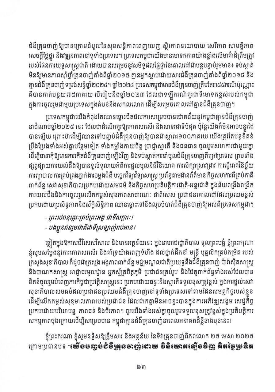 ភ្នំពេញ៖សម្តេចមហាបវរធិបតី ហ៊ុន ម៉ាណែត នាយករដ្ឋមន្ត្រីនៃកម្ពុជា បានចេញសារលិខិតអបអរសាទរ ក្នុងឱកាសទិវាជាតិប្រយុទ្ធនឹងជំងឺគ្រុនចាញ់ ក្រោមប្រធានបទ «យើងបញ្ចប់ជំងឺគ្រុនចាញ់ ដោយវិនិយោគឡើងវិញ គិតច្នៃប្រឌិតឡើងវិញ គ្រប់គ្រងឡើងវិញ» ថ្ងៃទី២៥ ខែមេសា ឆ្នាំ២០២៥៕