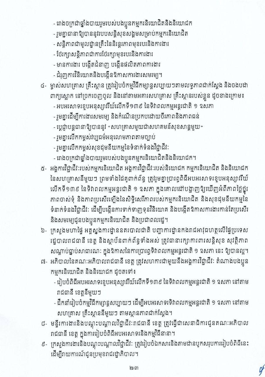ភ្នំពេញ៖សម្តេចមហាបវរធិបតី ហ៊ុន ម៉ាណែត នាយករដ្ឋមន្ត្រីនៃកម្ពុជា បានចេញសារាចរ ស្តីពី ការរៀបចំខួបអនុស្សាវរីយ៍លើកទី១៣៩ នៃទិវាពលកម្មអន្តរជាតិ ថ្ងៃទី១ ខែឧសភា ឆ្នាំ២០២៥។