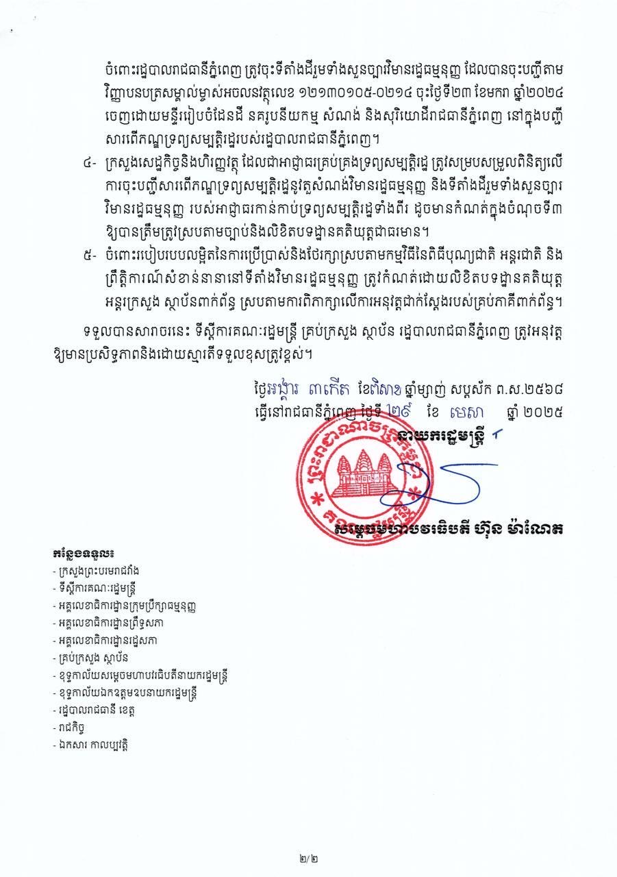 ក្នុងសារាចរណែនាំដែលបណ្ដាញព័ត៌មាន Fresh News ទទួលបាននៅថ្ងៃទី៣០ ខែមេសា ឆ្នាំ២០២៥នេះ សម្ដេចមហាបវរធិបតី ហ៊ុន ម៉ាណែត បានណែនាំចំនួន៥ចំណុច ដល់ស្ថាប័នដែលមានការពាក់ព័ន្ធត្រូវរួមគ្នាទទួលខុសត្រូវ៕