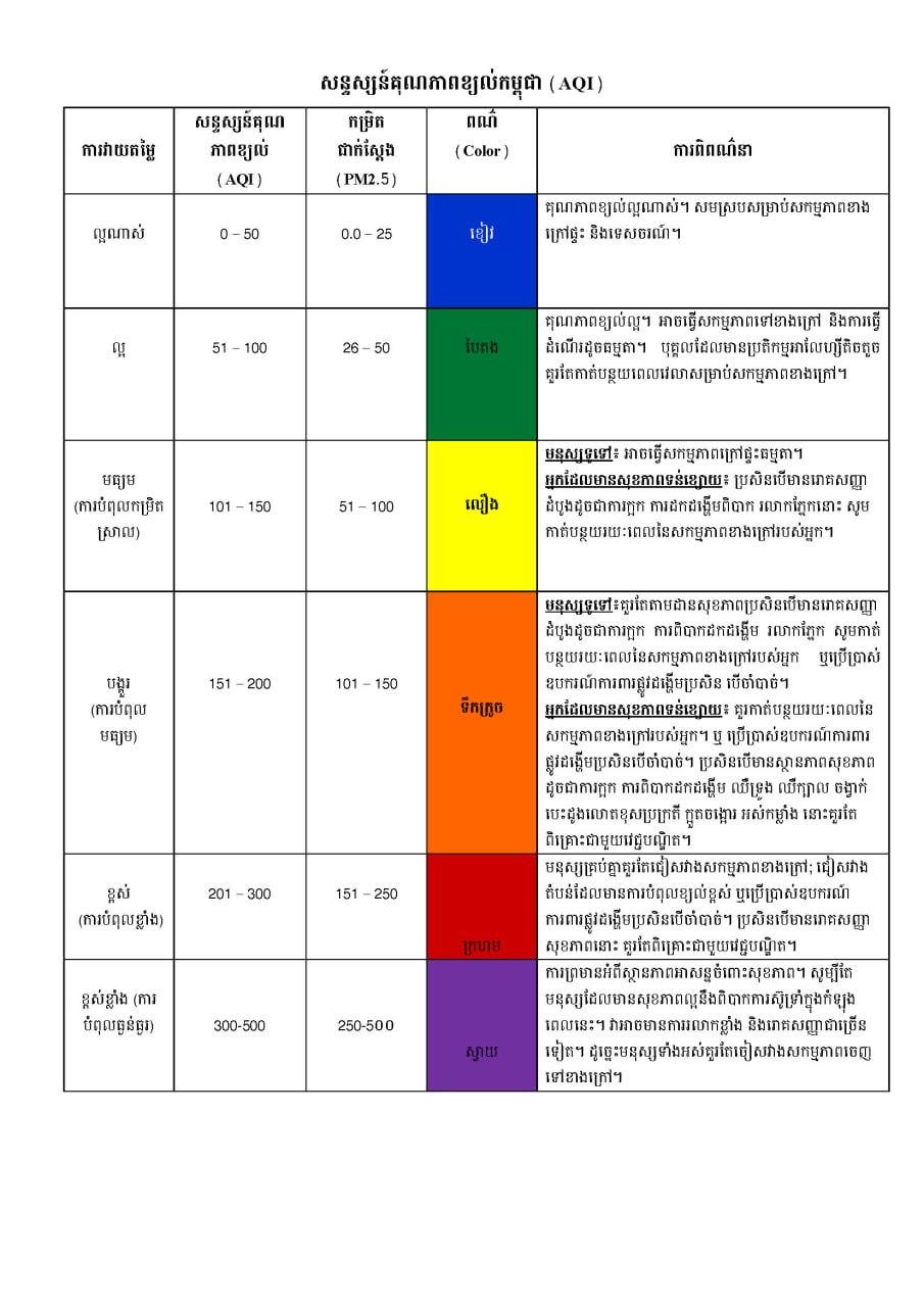 ពណ៌ខៀវៈ គុណភាពខ្យល់ល្អណាស់មានរាជធានីភ្នំពេញ ខេត្តស្ទឹងត្រែង ខេត្តរតនគិរី ខេត្តព្រះសីហនុ ខេត្តកោះកុង ខេត្តពោធិ៍សាត់ ខេត្តកំពង់ចាម ខេត្តកំពង់ស្ពឺ ខេត្តកណ្តាល ខេត្តមណ្ឌលគីរី ខេត្តកំពង់ឆ្នាំងខេត្តតាកែវ ខេត្តបាត់ដំបង ខេត្តកំពត ខេត្តក្រចេះ ខេត្តស្វាយរៀង ខេត្តកែប ខេត្តត្បូងឃ្មុំ ខេត្តព្រៃវែង និងខេត្តប៉ៃលិន, ពណ៌បៃតងៈ មាន ខេត្តបន្ទាយមានជ័យ ខេត្តកំពង់ធំ ខេត្តព្រះវិហារ ខេត្តសៀមរាប និង ខេត្តឧត្តរមានជ័យ៕