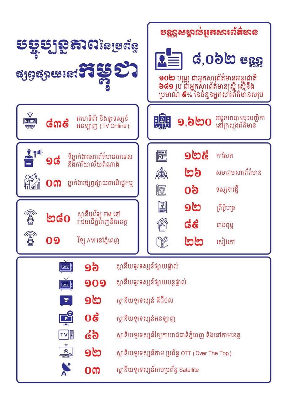 ជាមួយគ្នានេះដែរ ក្រោយធ្វើបច្ចុប្បន្នភាព, គិតត្រឹមត្រីមាសទី១ ឆ្នាំ២០២៥ ក្រសួងព័ត៌មានបានចុះបញ្ជីចំនួនសារព័ត៌មានជាតិ-បរទេស ដែលកំពុងដំណើរការផ្សាយចំនួន១ ៦២០ អង្គភាពរួមមាន៖