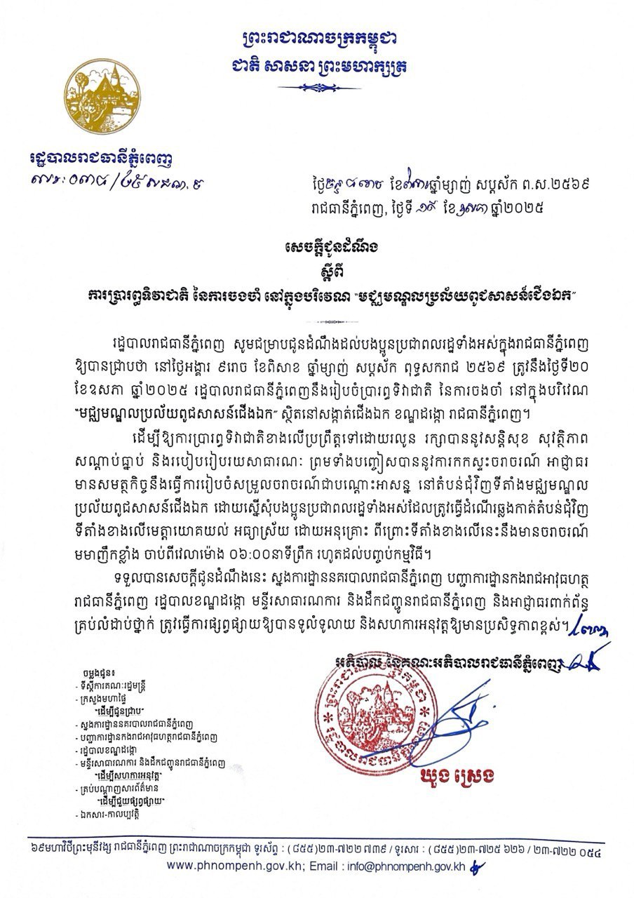 ភ្នំពេញ៖យោងតាមសេចក្តីជូនដំណឹងរបស់រដ្ឋបាល រាជធានីភ្នំពេញ បានឱ្យដឹងថានៅថ្ងៃអង្គារ ៩រោច ខែពិសាខ ឆ្នាំម្សាញ់ សប្តស័ក ពុទ្ធសករាជ ២៥៦៩ ត្រូវនឹងថ្ងៃទី២០ ខែឧសភា ឆ្នាំ២០២៥ រដ្ឋបាលរាជធានីភ្នំពេញនឹងរៀបចំប្រារព្ធទិវាជាតិ នៃការចងចាំ នៅក្នុងបរិវេណ “មជ្ឈមណ្ឌលប្រល័យពូជសាសន៍ជើងឯក” ស្ថិតនៅសង្កាត់ជើងឯក ខណ្ឌដង្កោ រាជធានីភ្នំពេញ។