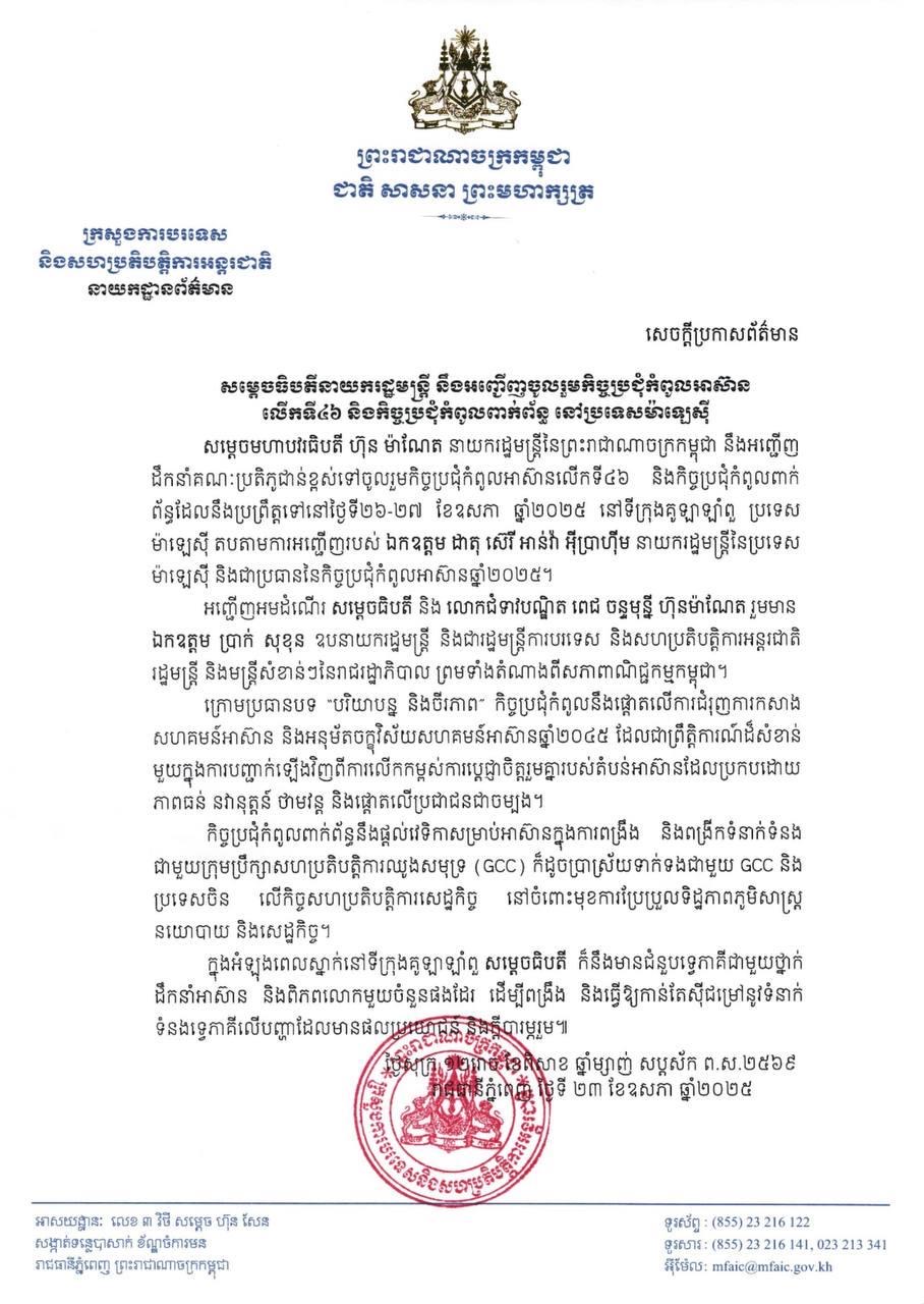 ក្រសួងការបរទេសកម្ពុជា បានបញ្ជាក់ថា ដំណើរអញ្ជើញចូលរួមកិច្ចប្រជុំ កំពូលអាស៊ាន និងកិច្ចប្រជុំកំពូលពាក់ព័ន្ធនេះ ធ្វើឡើង តបតាមការ អញ្ជើញ របស់លោក ដាតុ ស៊េរី អាន់វ៉ា ស៊ីប្រាហ៊ីម នាយករដ្ឋមន្ត្រីម៉ាឡេស៊ី និងជាប្រធានកិច្ចប្រជុំកំពូលអាស៊ានឆ្នាំ២០២៥។