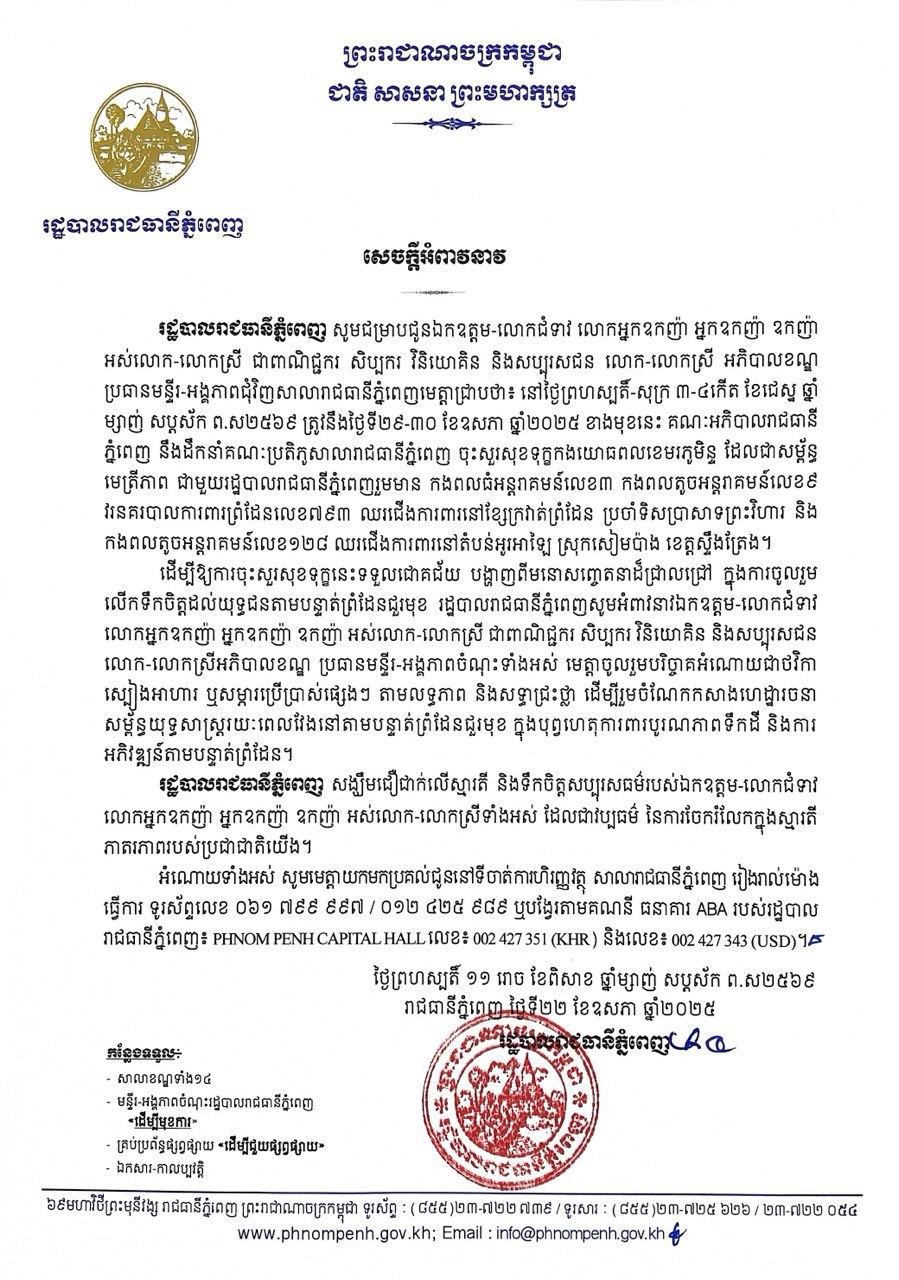 ក្នុងសេចក្តីអំពាវនាវរបស់រដ្ឋបាលរាជធានីភ្នំពេញបានឱ្យដឹងថា៖ រដ្ឋបាលរាជធានីភ្នំពេញ សូមជម្រាបជូនឯកឧត្តម-លោកជំទាវ លោកអ្នកឧកញ៉ា អ្នកឧកញ៉ា ឧកញ៉ា អស់លោក-លោកស្រី ជាពាណិជ្ជករ សិប្បករ វិនិយោគិន និងសប្បុរសជន លោក-លោកស្រី អភិបាលខណ្ឌ ប្រធានមន្ទីរ-អង្គភាពជុំវិញសាលារាជធានីភ្នំពេញមេត្តាជ្រាបថា៖ នៅថ្ងៃព្រហស្បតិ៍-សុក្រ ៣-៤កើត ខែជេស្ឋ ឆ្នាំ ម្សាញ់ សប្តស័ក ព.ស២៥៦៩ ត្រូវនឹងថ្ងៃទី២៩-៣០ ខែឧសភា ឆ្នាំ២០២៥ ខាងមុខនេះ គណៈអភិបាលរាជធានី ភ្នំពេញ នឹងដឹកនាំគណៈប្រតិភូសាលារាជធានីភ្នំពេញ ចុះសួរសុខទុក្ខកងយោធពលខេមរភូមិន្ទ ដែលជាសម្ព័ន្ធ មេត្រីភាព ជាមួយរដ្ឋបាលរាជធានីភ្នំពេញរួមមាន កងពលធំអន្តរាគមន៍លេខ៣ កងពលតូចអន្តរាគមន៍លេខ៩ វរនគរបាលការពារព្រំដែនលេខ៧៩៣ ឈរជើងការពារនៅខ្សែក្រវាត់ព្រំដែន ប្រចាំទិសប្រាសាទព្រះវិហារ និង កងពលតូចអន្តរាគមន៍លេខ១២៨ ឈរជើងការពារនៅតំបន់អូរអាឡៃ ស្រុកសៀមប៉ាង ខេត្តស្ទឹងត្រែង។