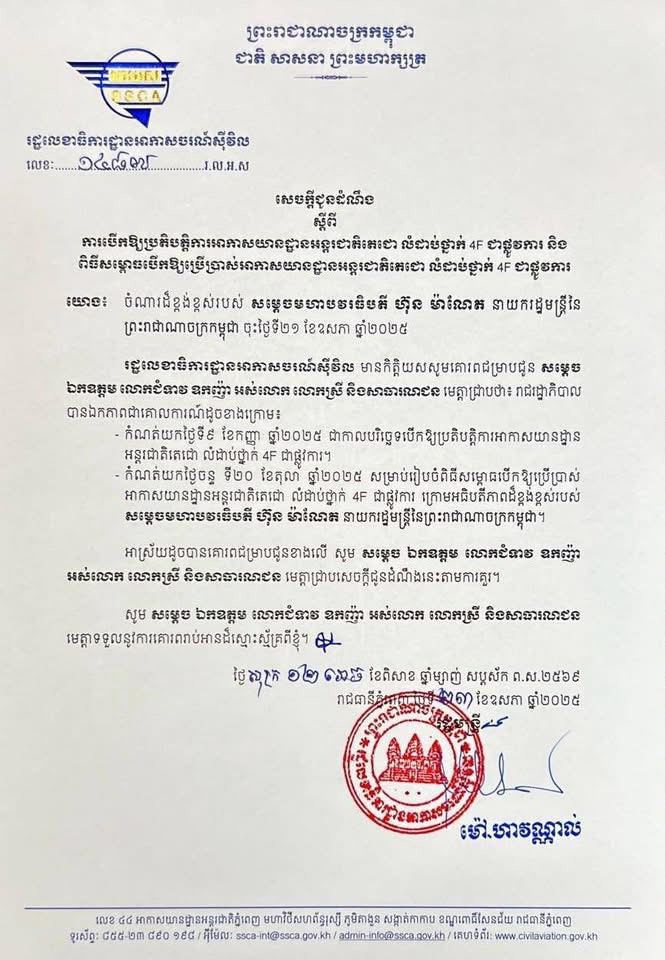 ភ្នំពេញ៖យោងតាមសេចក្ដីជូនដំណឹងរបស់អាកាសចរណ៌ស៊ីវិលកម្ពុជាថា៖អាកាសយានដ្ឋានអន្តរជាតិតេជោ លំដាប់ថ្នាក់ 4F នឹងបើកដំណើរការថ្ងៃទី៩ ខែកញ្ញា ឆ្នាំ២០២៥ ខាងមុខនេះ
