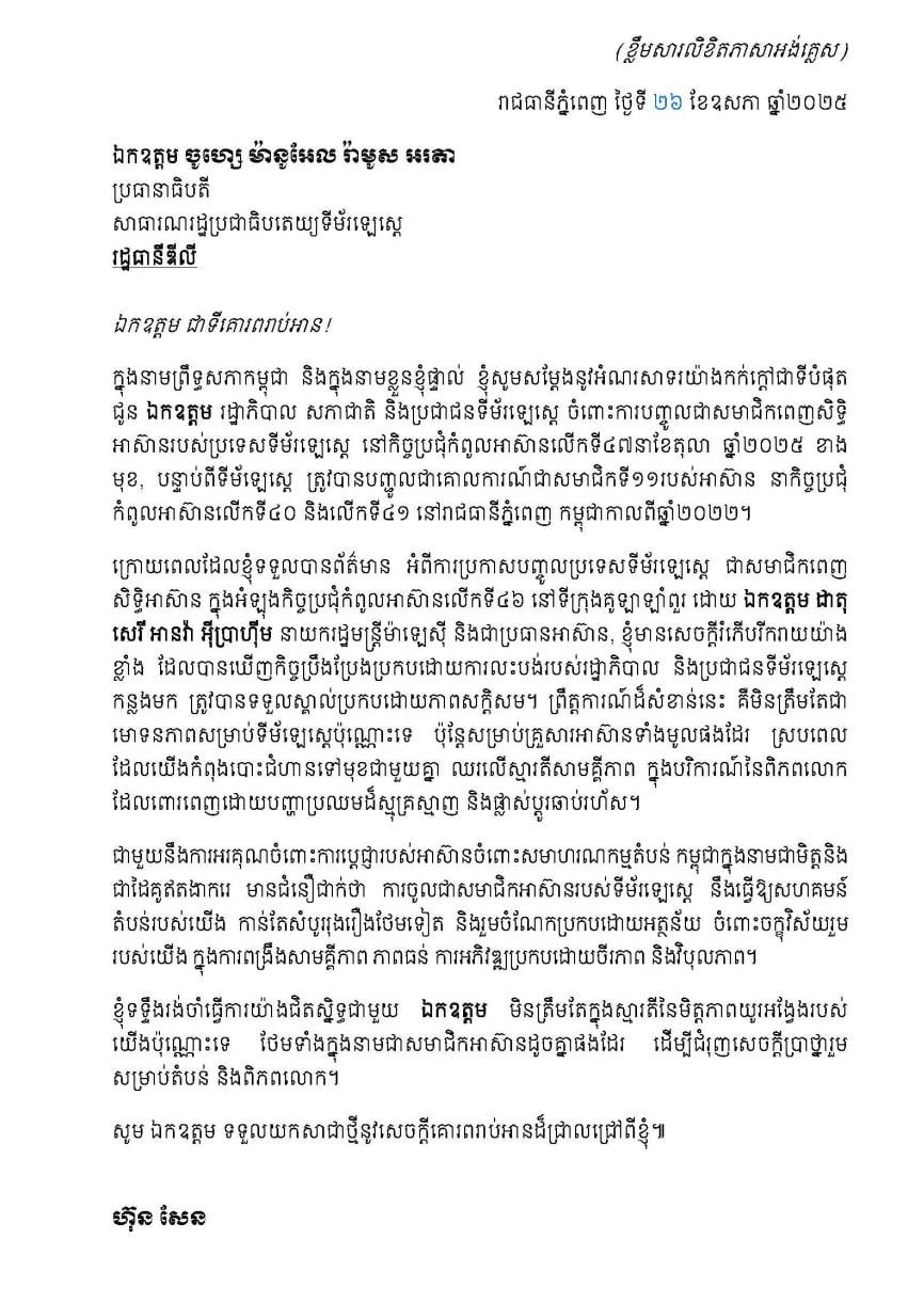 សម្តេចតេជោ ហ៊ុន សែន ផ្ញើលិខិតអបអរសាទរជូនប្រធានាធិបតីទីម័រឡេស្តេ ចំពោះការបញ្ចូលជាសមាជិកពេញសិទ្ធិអាស៊ាន នៅកិច្ចប្រជុំកំពូលអាស៊ានលើកទី៤៧ នាខែតុលា ឆ្នាំ២០២៥ ខាងមុខ