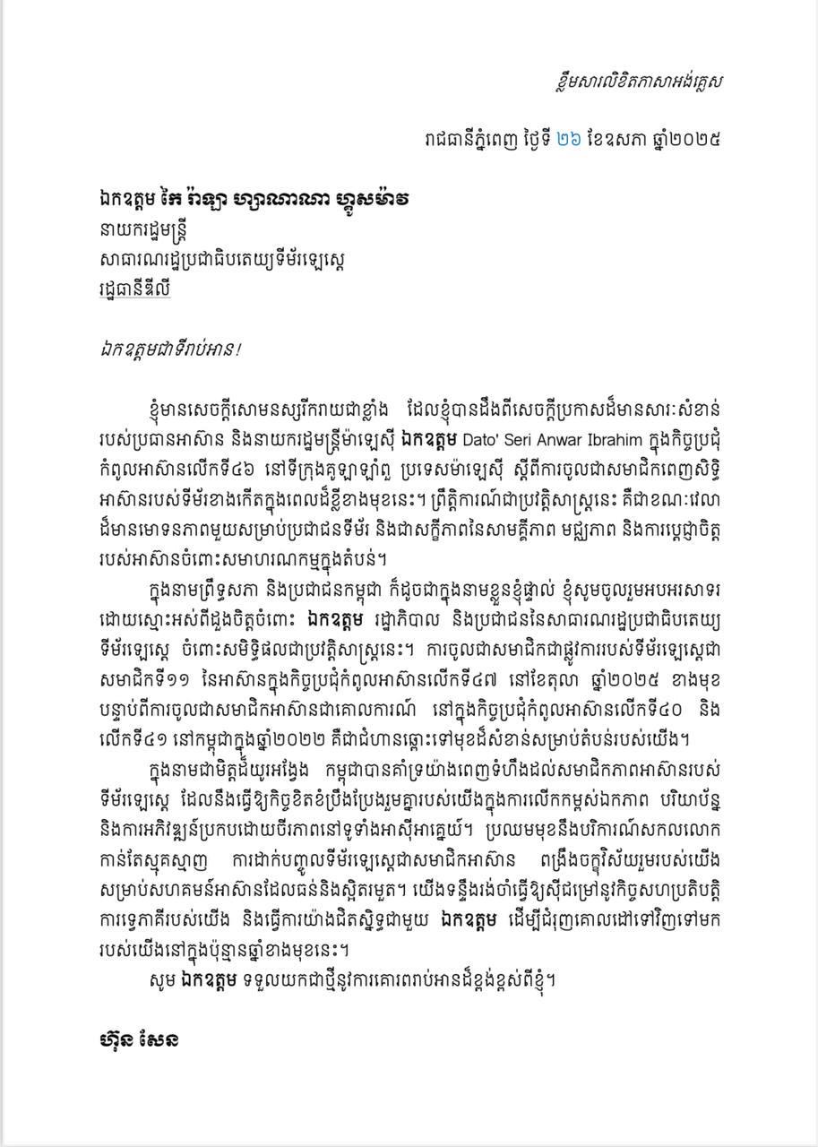 ភ្នំពេញ៖សម្តេចតេជោ ហ៊ុន សែន ប្រធានព្រឹទ្ធសភាកម្ពុជា នាថ្ងៃទី២៦ ខែឧសភា ឆ្នាំ២០២៥ បានផ្ញើលិខិតអបអរសាទរជូន ឯកឧត្តម កែ រ៉ាឡា ហ្សាណាណា ហ្គូសម៉ាវ នាយករដ្ឋមន្ត្រីសាធារណរដ្ឋប្រជាធិបតេយ្យទីម័រឡេស្តេ ចំពោះការបញ្ចូលជាសមាជិកពេញសិទ្ធិអាស៊ានរបស់ប្រទេសទីម័រឡេស្តេ នៅកិច្ចប្រជុំកំពូលអាស៊ានលើកទី៤៧ នាខែតុលា ឆ្នាំ២០២៥ ខាងមុខ។