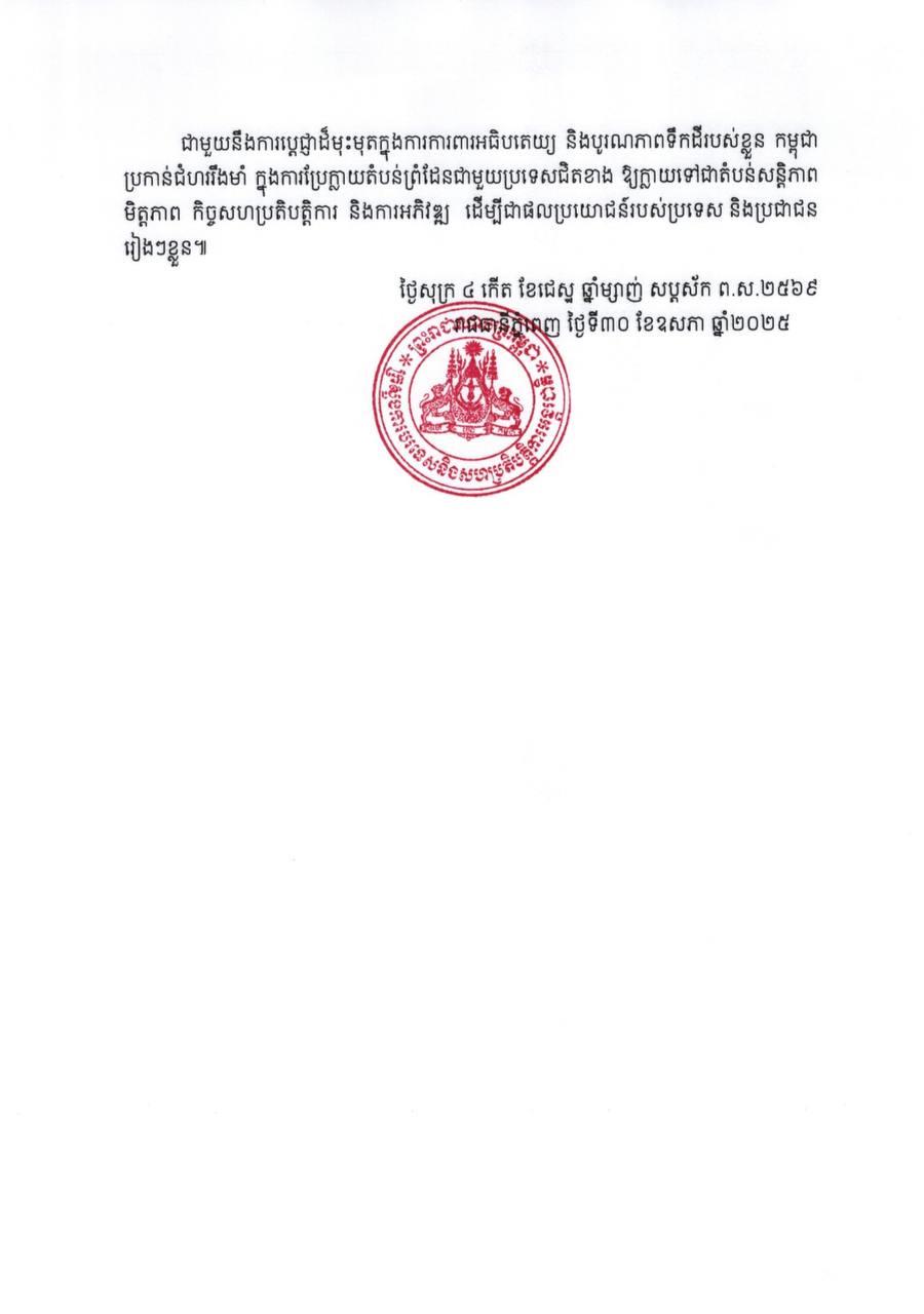 រដ្ឋមន្ត្រីការបរទេសទាំងពីរ បានកត់សម្គាល់អំពីការប្រាស្រ័យទាក់ទងគ្នាភ្លាមៗ រវាងសម្តេចអគ្គមហាសេនាបតីតេជោ ហ៊ុន សែន ប្រធានព្រឹទ្ធសភា និងសម្តេចមហាបវរធិបតី ហ៊ុន ម៉ាណែត នាយករដ្ឋមន្ត្រី នៃព្រះរាជាណាចក្រកម្ពុជា ជាមួយលោកជំទាវ ផែថងថាន ស៊ីណាវ៉ាត្រ នាយករដ្ឋមន្ត្រីនៃព្រះរាជាណាចក្រថៃ ដែលបានបញ្ជាក់អំពីការប្តេជ្ញារក្សាទំនាក់ទំនងមិត្តភាពជាប្រពៃណី ភាពជាអ្នកជិតខាងល្អ ការយោគយល់និងជឿទុកចិត្តគ្នាទៅវិញទៅមក ក្នុងការដោះស្រាយរាល់ជម្លោះដែល កើតឡើងជាយថាហេតុដោយសន្តិវិធី ឈរលើមូលដ្ឋាននៃការគោរពអធិបតេយ្យភាព និងបូរណភាព ទឹកដីរៀងៗខ្លួន ។