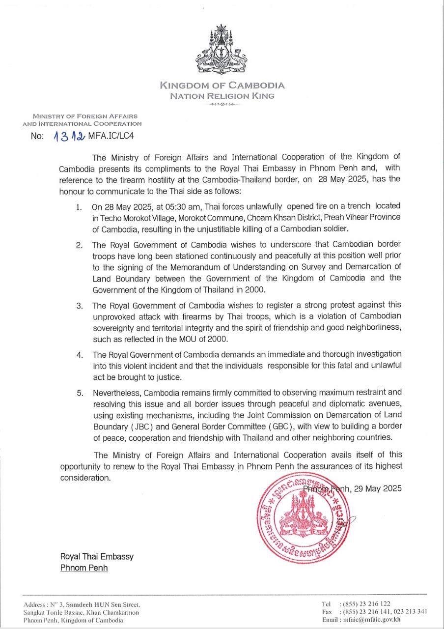 តាមរយៈកំណត់ទូតនេះ ក្រសួងការបរទេសកម្ពុជា បានរៀបរាប់ថា កាលពីថ្ងៃទី២៨ ខែឧសភា ឆ្នាំ២០២៥ វេលាម៉ោង ៥៖៣០នាទីព្រឹក កងកម្លាំងថៃ បានបើកការបាញ់ប្រហារដោយខុសច្បាប់ទៅលើលេណដ្ឋានមួយកន្លែងរបស់កម្ពុជា ស្ថិតក្នុងភូមិតេជោមរកត ឃុំមរកត ស្រុកជាំក្សាន្ត ខេត្តព្រះវិហារ បណ្តាលឱ្យស្លាប់ទាហានខ្មែរដោយអយុត្តិធម៌។