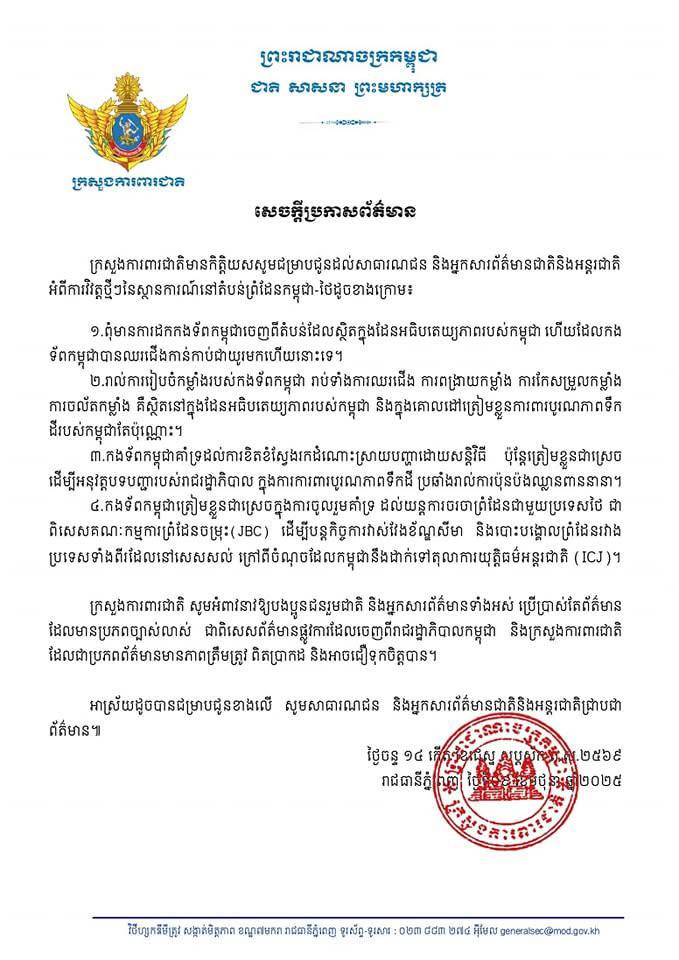 ១. ក្រសួងការពារជាតិកម្ពុជាបានចេញសេចក្តីប្រកាសព័ត៌មាន បញ្ជាក់អំពីជំហរយ៉ាងច្បាស់លាស់របស់កងទ័ពកម្ពុជានៅព្រំដែនកម្ពុជា-ថៃ ÷