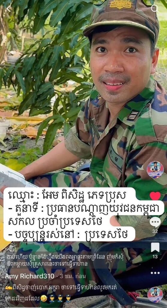លោកឧត្តមសេនីយ៍ឯក ជួន ណារិន្ទ អគ្គស្នងការរង និងជាស្នងការនគរបាលរាជធានីភ្នំពេញ បានបញ្ជាក់នៅព្រឹកថ្ងៃទី១០ ខែមិថុនា ឆ្នាំ២០២៥នេះថា «ប៉ុន្មានថ្ងៃនេះមានផេកយុវជនម្នាក់នេះ ក្លែងបន្លំជាយោធានៅព្រុំដែន បង្ហោះលើបណ្ដាញសង្គមដែលធ្វើឲ្យមហាជនយើងយល់ច្រឡំ។ យុវជននេះ បច្ចុប្បន្នរស់នៅប្រទេសថៃ មិនមែនជាយោធាទេ (ជាជនបំពុលសង្គម)»។
