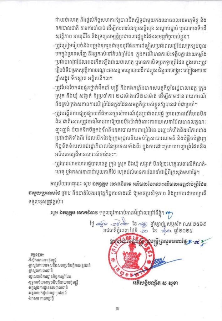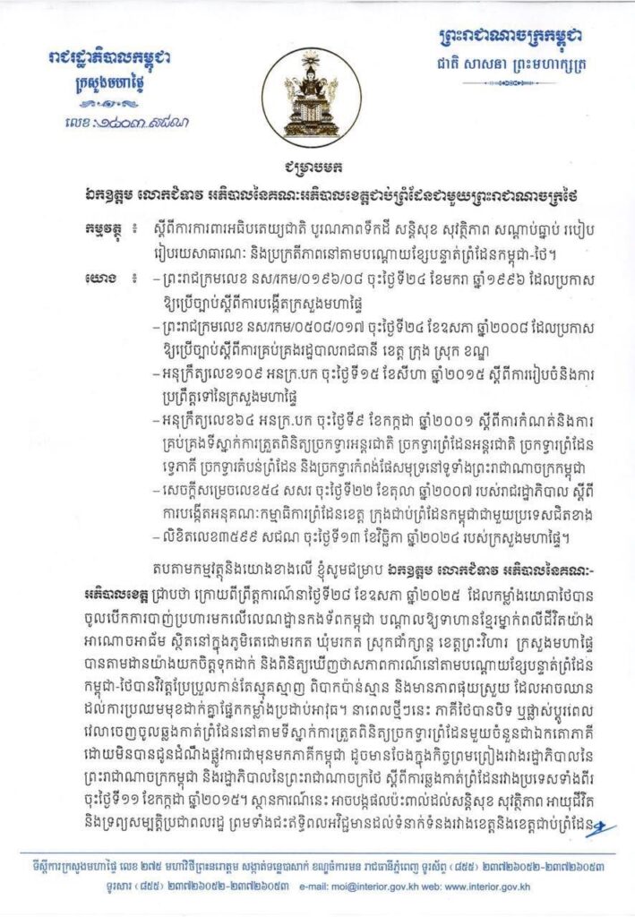 រដ្ឋមន្រ្តីក្រសួងមហាផ្ទៃ ផ្ញើលិខិតជូនអភិបាលខេត្តជាប់ព្រំដែនជាមួយថៃ ស្តីពីការការពារអធិបតេយ្យជាតិបូរណភាពទឹកដី សន្តិសុខ សុវត្ថិភាព សណ្ដាប់ធ្នាប់ របៀបរៀបរយសាធារណៈ និងប្រក្រតីភាពនៅតាមបណ្ដោយខ្សែបន្ទាត់ព្រំដែនកម្ពុជា-ថៃ