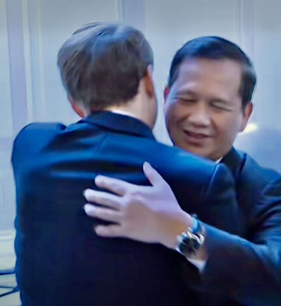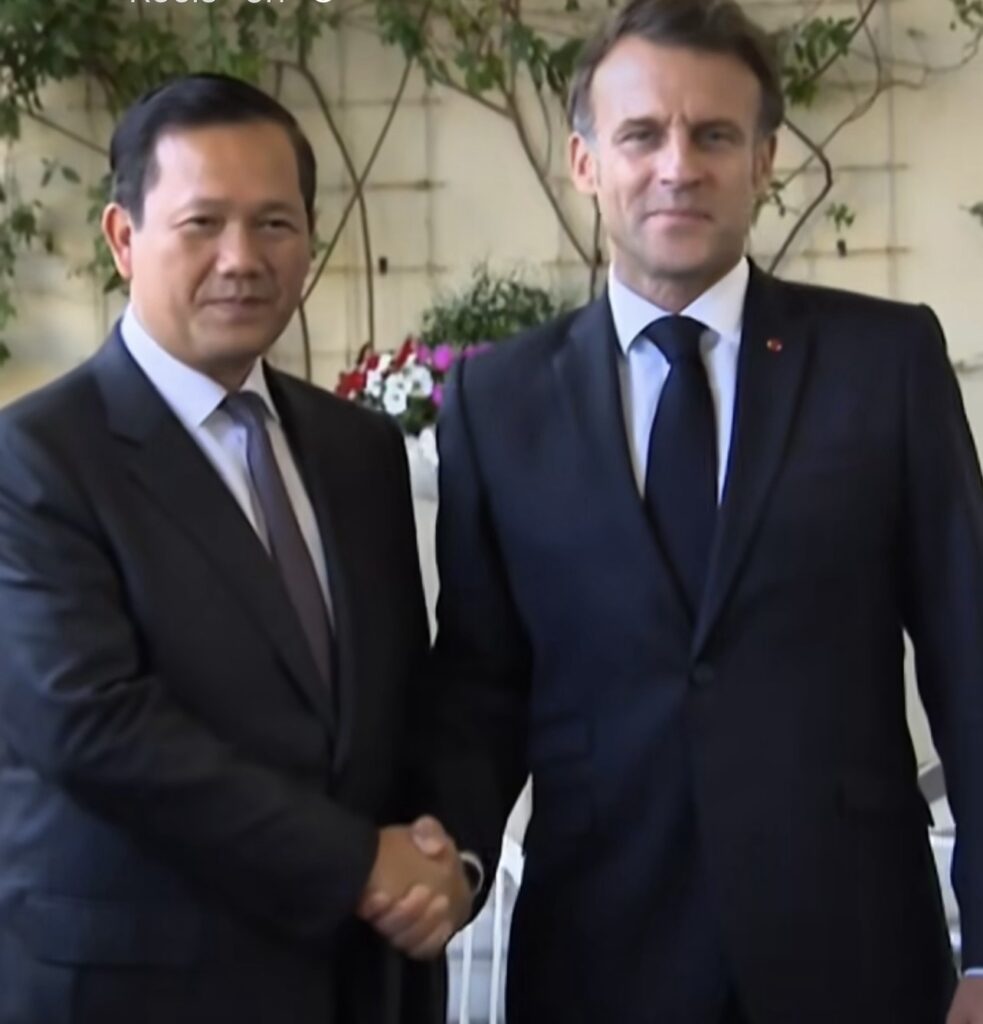 ប៉ារីស៖នាល្ងាចថ្ងៃទី១០ ខែមិថុនា ឆ្នាំ២០២៥, សម្តេចមហាបវរធិបតី ហ៊ុន ម៉ាណែត នាយករដ្ឋមន្ត្រីនៃព្រះរាជាណាចក្រកម្ពុជា បានជួបពិភាក្សាទ្វេភាគីជាមួយ ឯកឧត្តម Emmanuel Macron ប្រធានាធិបតី នៃសាធារណរដ្ឋបារាំង ក្នុងឱកាសអញ្ជើញចូលរួមសន្និសីទលើកទី៣ របស់អង្គការសហប្រជាជាតិ ស្តីពីមហាសមុទ្រ (UNOC3) នៅថ្ងៃទី០៨-១៣ ខែមិថុនា ឆ្នាំ២០២៥ នៅទីក្រុងនីស ប្រទេសបារាំង។