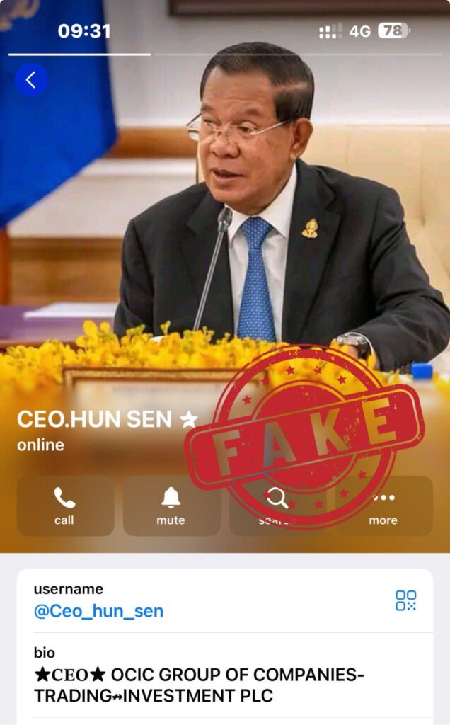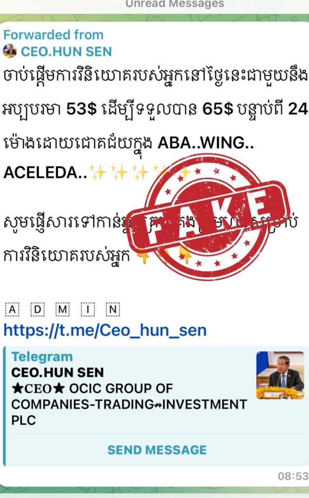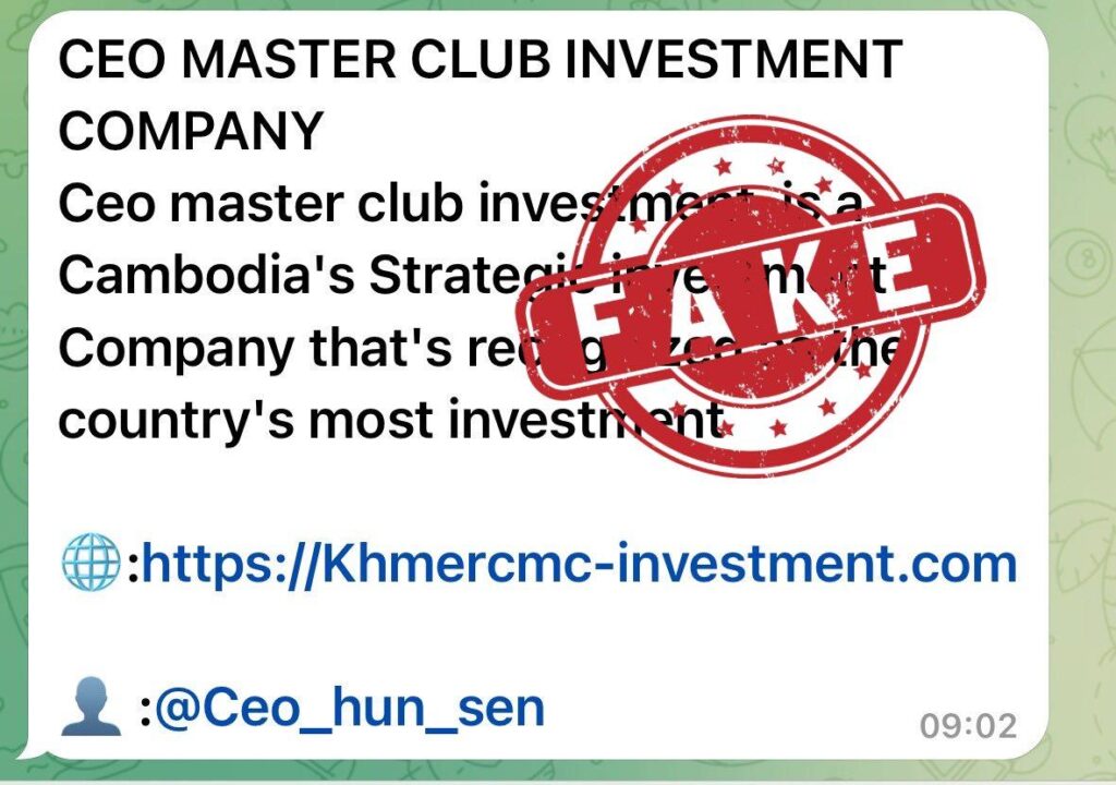 ភ្នំពេញ៖ជនខិលខូចក្លែងបន្លំធ្វើជាគណនី Telegram របស់សម្តេចតេជោ ហ៊ុន សែន មានដោយបានដាក់ឈ្មោះ CEO.HUN SEN (មាន Username: @Ceo_hun_sen) និងបានភ្ជាប់ជាមួយ website ឆបោកមួយ https://Khmercmc-investment.com អោយបងប្អូនដាក់ទុនវិនិយោគដើម្បីបានប្រាក់ចំណេញ(ឆបោក)។