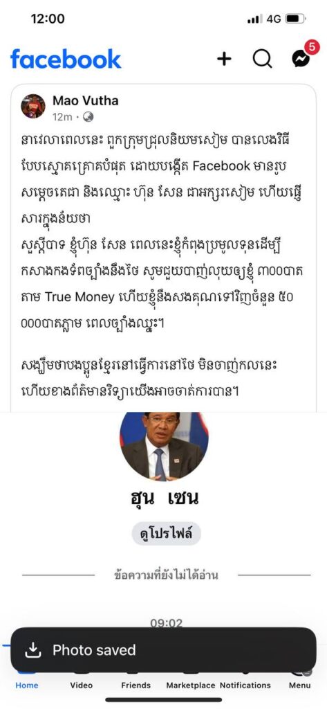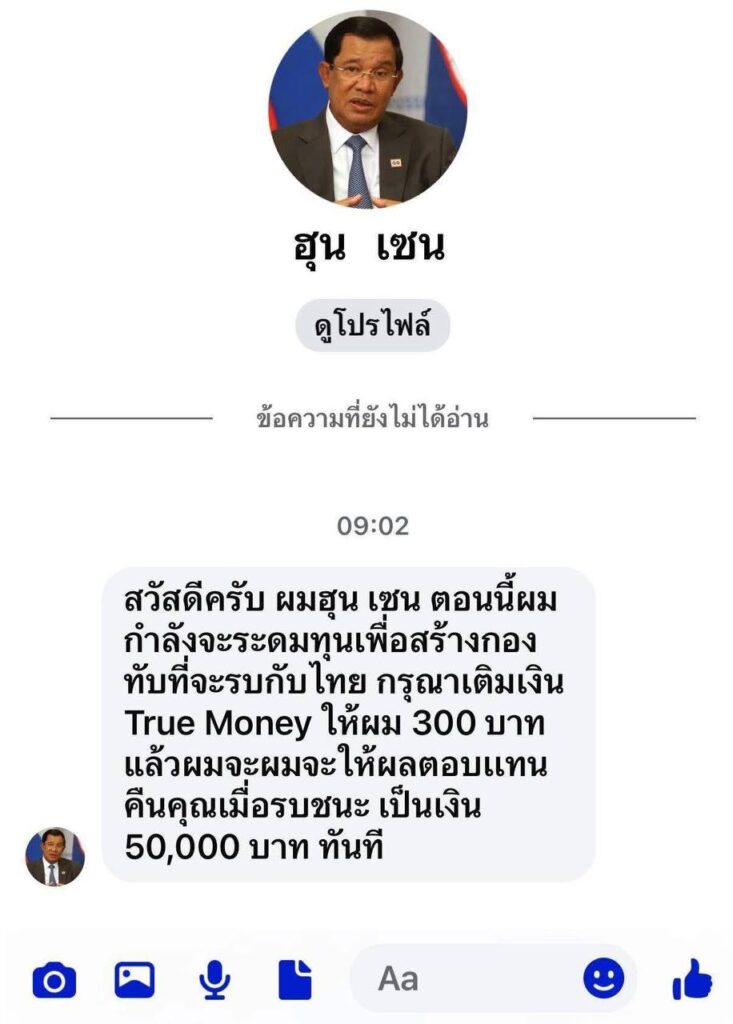 សូមបញ្ជាក់ថា៖ថ្មីៗនេះ ពួកក្រុមជ្រុលនិយមសៀម បានលេងវិធីបែបស្មោគគ្រោគបំផុត ដោយបង្កើត Facebook មានរូបសម្តេចតេជា និងឈ្មោះ ហ៊ុន សែន ជាអក្សរសៀម ហើយផ្ញើសារក្នុងន័យថា «សួស្តីបាទ ខ្ញុំហ៊ុន សែន »ពេលនេះខ្ញុំកំពុងប្រមូលទុនដើម្បីកសាងកងទ័ពច្បាំងនឹងថៃ សូមជួយបាញ់លុយឲ្យខ្ញុំ ៣០០បាត តាម True Money ហើយខ្ញុំនឹងសងគុណទៅវិញចំនួន ៥០ ០០០បាតភ្លាម ពេលច្បាំងឈ្នះ។