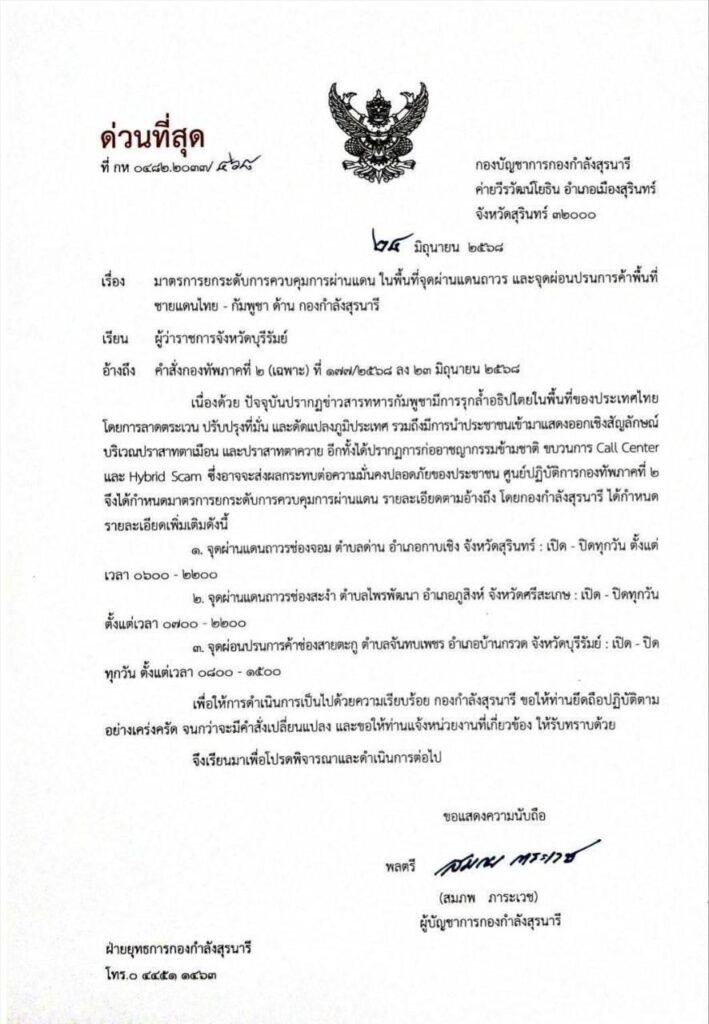 សូមបញ្ជាក់ថា កាលពីថ្ងៃទី២៣ ខែមិថុនា ឆ្នាំ២០២៥ យោធាភូមិភាគី២របស់ថៃ បានចេញបញ្ជាឱ្យបិទច្រកព្រំដែនទាំងអស់ជាមួយកម្ពុជា ដោយអនុញ្ញាតឱ្យចេញចូលតែ សិស្សានុសិស្ស និងអ្នកជំងឺដែលត្រូវការការព្យាបាលបន្ទាន់តែប៉ុណ្ណោះ។