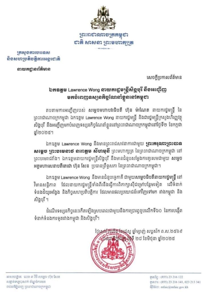ភ្នំពេញ៖តបតាមការអញ្ជើញរបស់ សម្តេចមហាបវរធិបតី ហ៊ុន ម៉ាណែត នាយករដ្ឋមន្ត្រីនៃកម្ពុជា លោក Lawrence Wong នាយករដ្ឋមន្ត្រី និងជារដ្ឋមន្ត្រីក្រសួងហិរញ្ញវត្ថុ សិង្ហបុរី នឹងអញ្ជើញមកបំពេញទស្សនកិច្ចណែនាំខ្លួននៅកម្ពុជា នៅថ្ងៃទី២ ខែកក្កដា ឆ្នាំ២០២៥។ នេះបើតាមសេចក្តីប្រកាសរបស់ក្រសួងការបរទេសដែល ទទួលបាន។