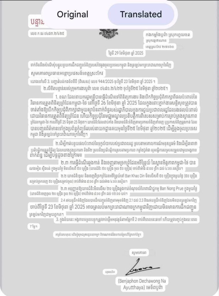 ខាងក្រោមនេះជាសំណេរទាំងស្រុងរបស់សម្តេចបវរធិបតី ហ៊ុន ម៉ាណែត៖«ព្រឹកថ្ងៃអាទិត្យ ទី ២៩ មិថុនា ២០២៥ នេះ អាជ្ញាធរមានសមត្ថកិច្ចរបស់កម្ពុជាបានទទួលលិខិតពីភាគីថៃនៅខេត្តស្រះកែវ ស្នើសុំឱ្យមានការបើកច្រកព្រំដែនកម្ពុជា-ថៃមួយចំនួន និងអនុញ្ញាតឲរថយន្តដឹកទំនិញចេញ-ចូល ដើម្បីបន្ធូរការប៉ះពាល់ដល់ជីវភាពរស់នៅរបស់ប្រជាពលរដ្ឋ។